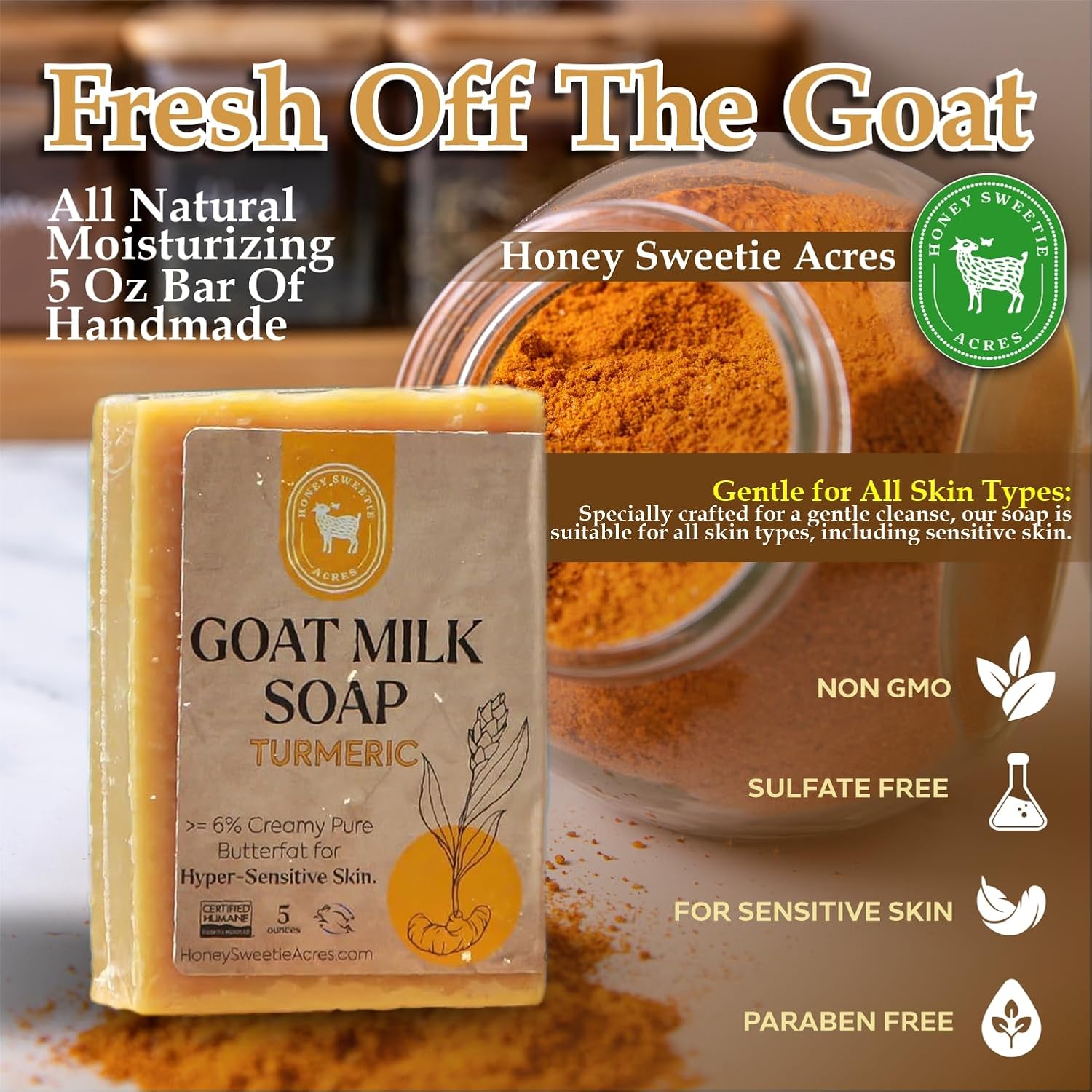 Honey Sweetie Acres Turmeric Goat Milk Soap – Handmade 5 oz Bar, Made with Natural Ingredients, Moisturizing & Gentle, Made in the USA