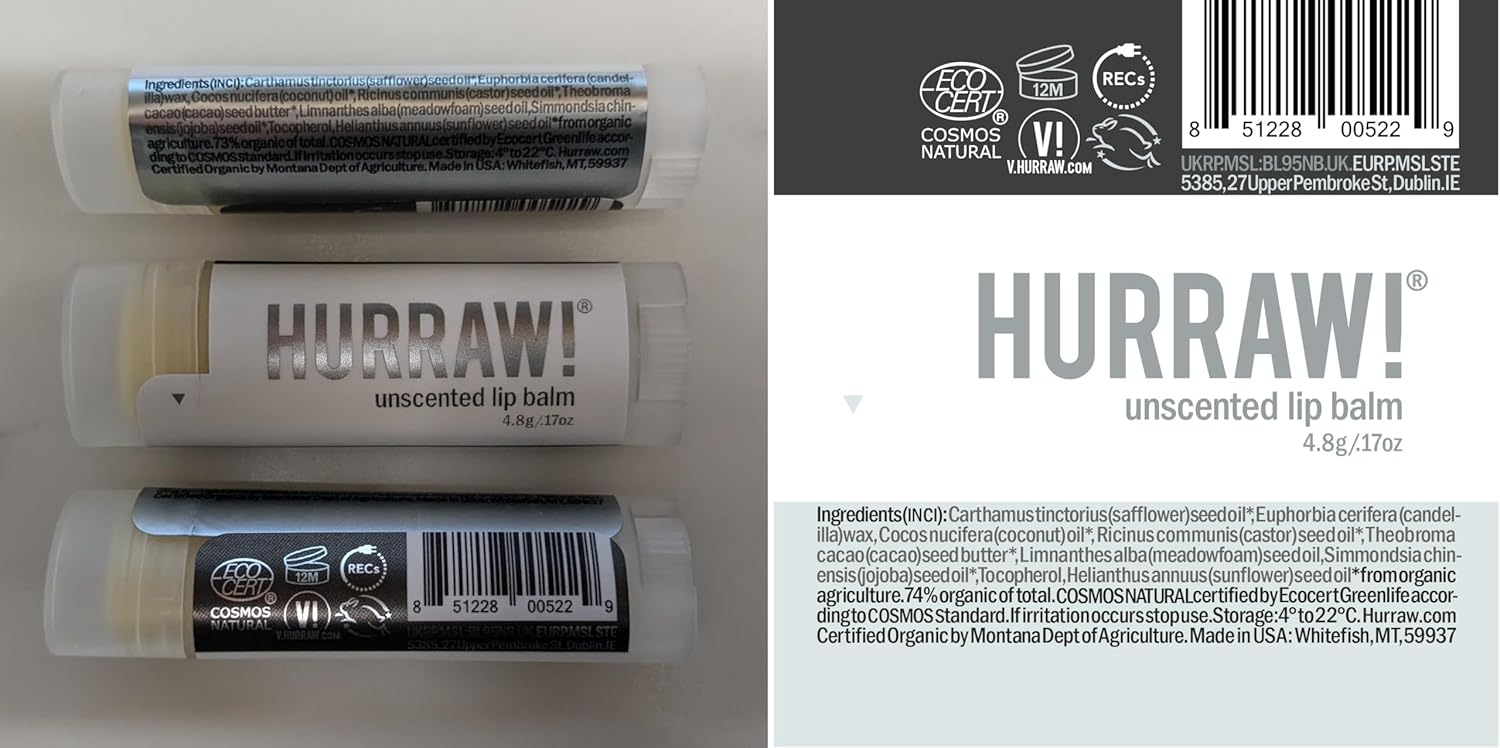 TWO 4.8g/.17oz Oval Tubes of Unscented Lip Balm packaged in a white HURRAW! branded pillow box. Our unscented balm is nut-oil free and contains no added aroma. It contains meadowfoam seed oil; a superstar moisturizer. Use it on your lips, your cuticles. Sometimes nothing is really something. Made with certified organic, vegan, and raw ingredients. Hurraw! Lip Balms are certified 100% all natural origin, cruelty & gluten free. Non-GMO. Bee, Shea, Soy and Palm Free.