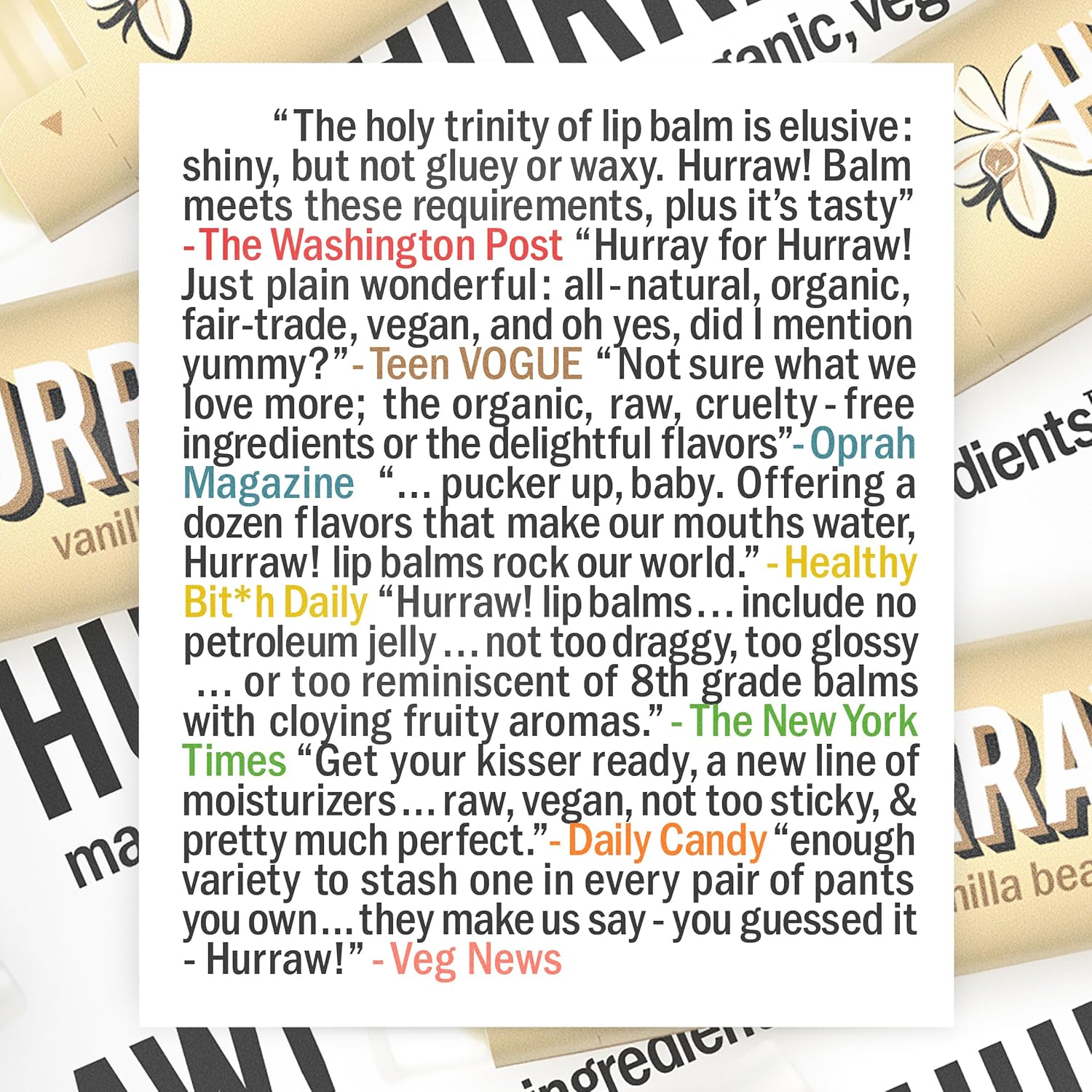 CRITERIA: Hurraw! Lip Balms are all natural, vegan, raw, made with premium fair trade ingredients, super smooth, not draggy, not sticky, not sweet, not too glossy, not too smelly. Never grainy. Long lasting and no melting in a back jean pocket! Made in Montana, USA.