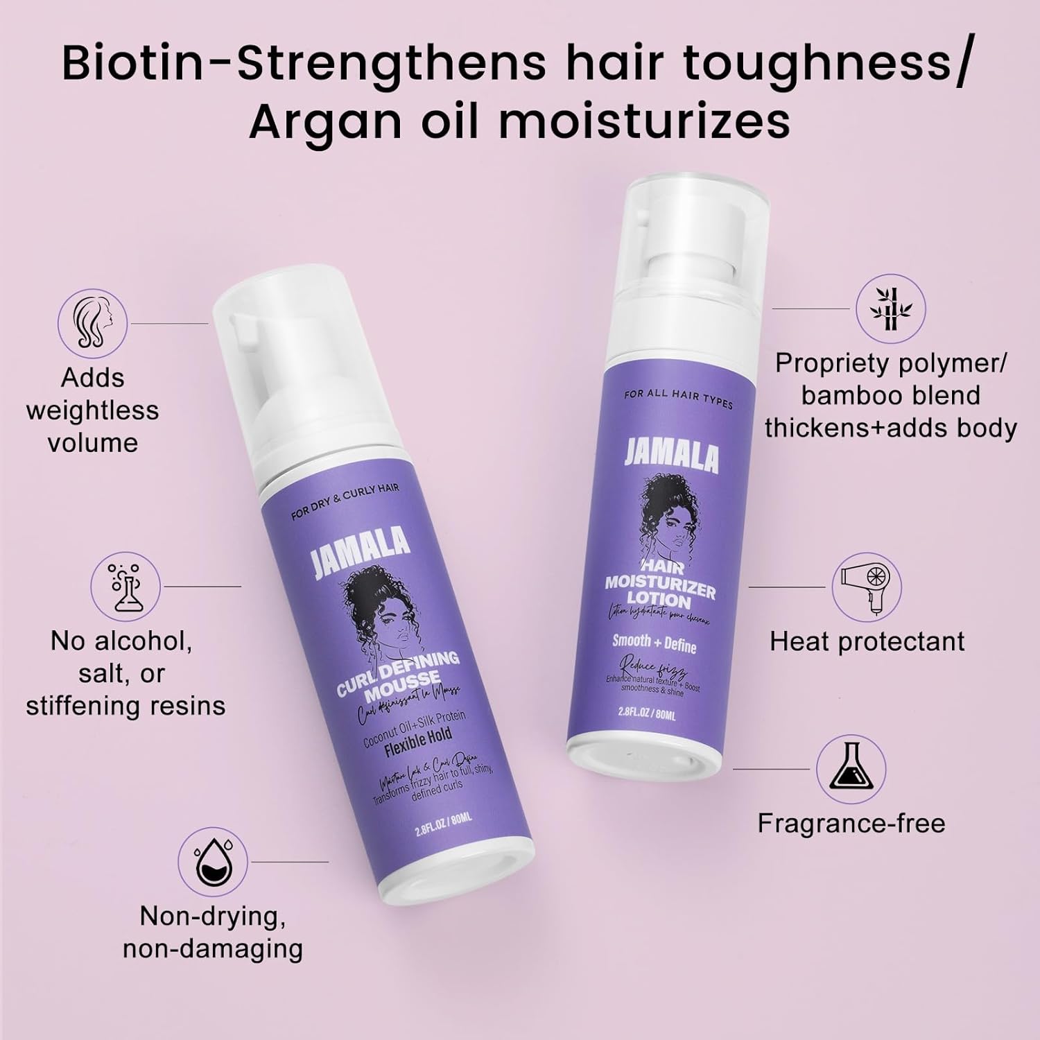 JAMALA Hair Moisturizer Lotion & Curl Defining Mousse Travel size 2.8 Fl Oz / bottle Pack of 2 Nourish , define, and elevate your curls with the JAMALA hair care duo