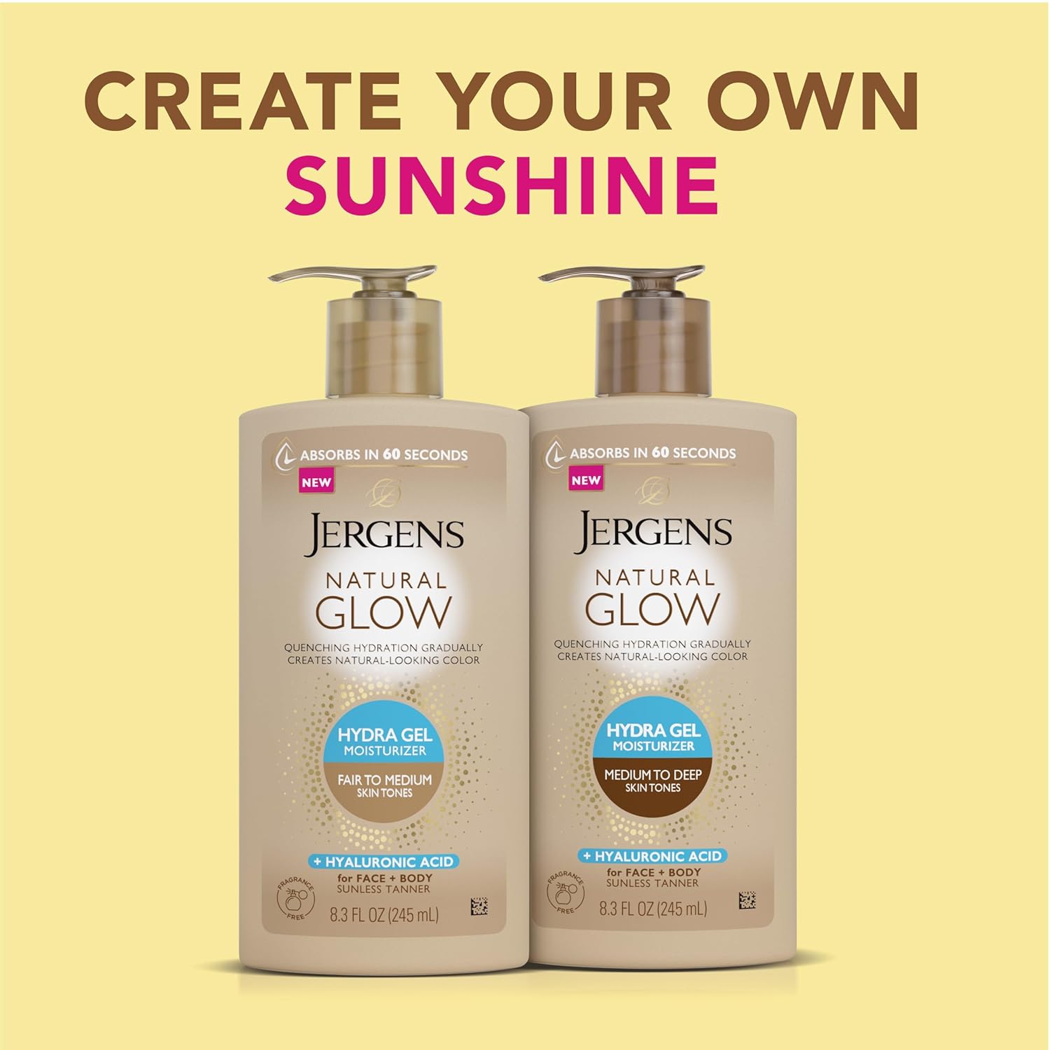 Create your own sunshine with Jergens Natural Glow Hydra Gel Moisturizer for Fair to Medium Skin Tones. This Hyaluronic acid tanning lotion provides quenching lightweight hydration while gradually creating sun-kissed color for a soft, natural glow. Known to have powerful moisturizing and hydrating properties, hyaluronic acid hydrates skin for a soft, plump, and smooth appearance. This is also a fragrance-free self tanner, so you can enjoy your glow without any overpowering scents. Get dressed quickly after applying our quick-absorbing self tanner, with only a 60 second absorption time! Spread the self tanner effortlessly for smooth and even coverage, resulting in a streak-free, natural glow from head to toe. Dermatologist tested and fragrance free, it won’t clog your pores, making it perfect for use on both your face and body. This quenching hyaluronic acid tanning lotion gradually creates beautiful, natural-looking color. The color is formulated for fair to medium skin tones. For the best results, use our self tanner daily. Smooth on evenly and completely, and use sparingly on your elbows, knees and ankles and around facial hair. After applying, wash your hands. You will begin to see a subtle development of color within several days.