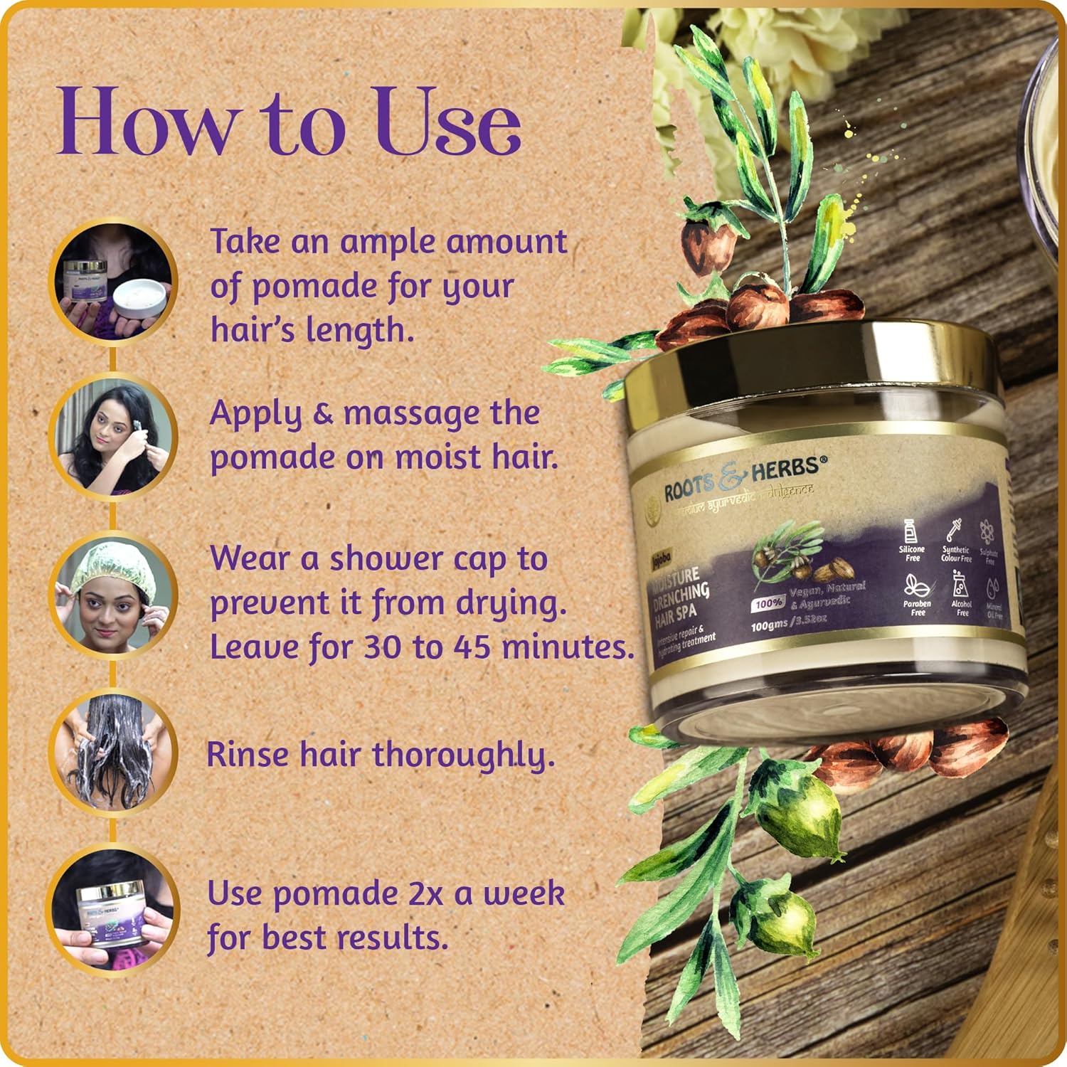 Flaunt Gorgeous Hair with Roots and Herbs’ Jojoba Moisture Drenching Hair Pomade! Enriched with nourishing jojoba oil, argan oil, and aloe vera, our mask hair treatment for dry damaged hair repair is rich in essential fatty acids, vitamins, and minerals. Our curly hair mask deep conditioner‘s potent ingredients deeply penetrate your strands, locking in moisture and leaving your hair irresistibly smooth, soft, shiny, and voluminous. Utilizing the potent benefits of castor oil, thyme oil, jatamansi, neem, ashwagandha, hibiscus, and bhringaraj, our hair moisturizer for dry hair damaged provides comprehensive nourishment from the roots to the tips. Our hair conditioning mask’s powerful blend strengthens your strands and safeguards against the elements, making a great hair moisturizer for curly hair or hair moisturizer for dry hair. Enriched with geranium oil, palmarosa oil, lavender oil, and shea butter, our hair moisture mask deeply hydrates the scalp. This hydrating hair mask for fine hair and curly hair mask for damaged curls also eases itchiness, reduces redness, and supports the scalp’s natural moisture barrier. Product Features Ayurvedic Formulation Vegan Halal Cruelty-Free No Alcohol No Barium Sulphide No Silicone No Paraben No Artificial Color No Sulfate No Ammonia No Mineral Oil Perfect for: Straight Hair Wavy Hair Hair Mask for Curly Hair Fine Locks Braided Hair Hair Mask for Dry Damaged Hair Beard Ingredients: Jojoba Oil Castor Oil Argan Oil Geranium Oil Palmarosa Oil Lavender Oil Thyme Oil Shea Butter Jatamanasi Aloe Vera Neem Ashwagandha Hibiscus Bhringaraj Instructions Take an ample amount of hair deep conditioning treatment. Apply and massage the moisturizing hair masks for dry damaged hair on moist hair. Wear a shower cap to prevent the deep moisture hair mask curly hair from drying. Leave for 30 to 45 minutes. Rinse off the hair treatment masks thoroughly. Use pomade 2x a week for best results. From Roots to Lab At Roots and Herbs, we are dedicat