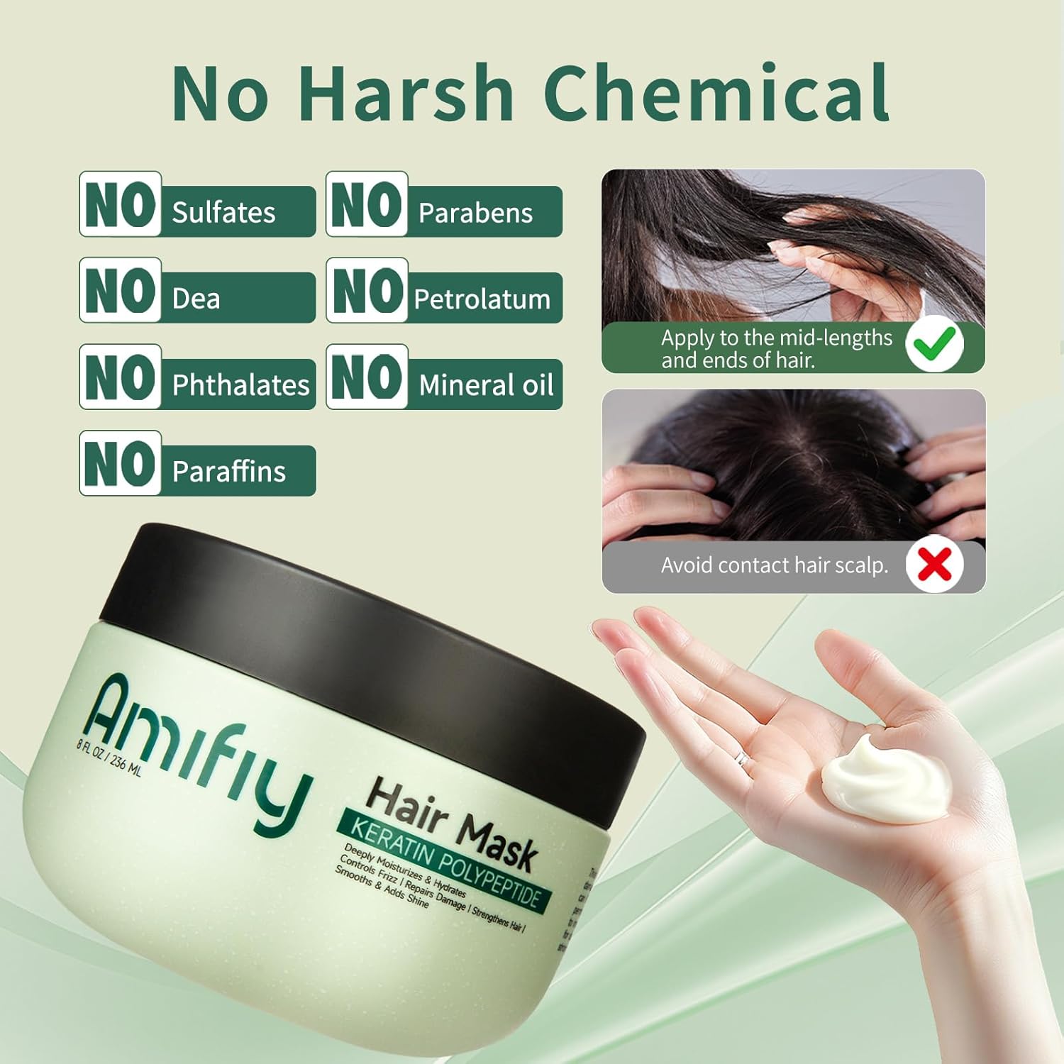 Deep Conditioner Repairs Dry Damaged Hair: Amifiy hair mask can fill damaged hair scales, repairs split ends, and mends breakage. It is suitable for damaged hair, permed hair, color-treated hair, and hair prone to tangles.