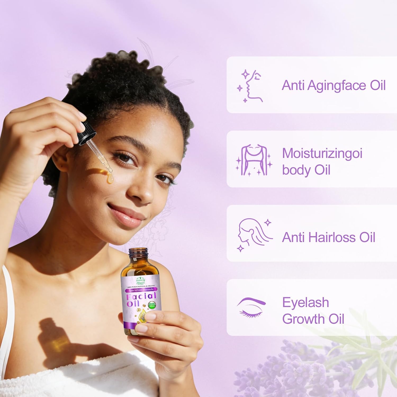 ✨ Anti Aging Moisturizing Skin: MMPANG lavender blend facial oil helps significantly reduce the appearance of fine lines, supports natural skin tightening, and promotes bright and even skin tone. The safe formula contains jojoba oil that balances moisture and carrot seed oil that regulates skin tone, which can even out skin tone and nourish dry areas.(Suitable for dry, oily, combination and sensitive skin. Before full use, a patch test must be conducted.)