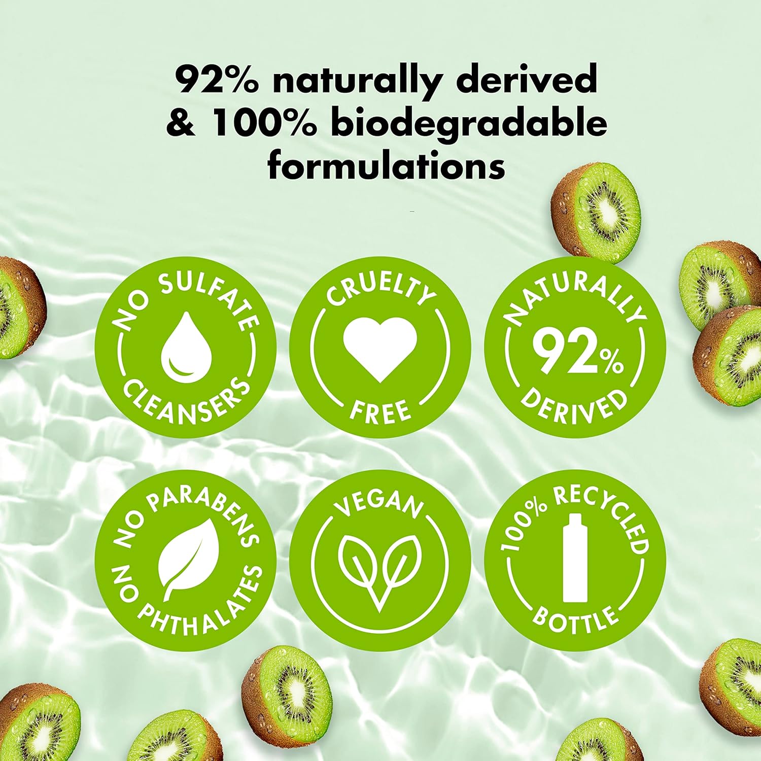 PLANT-BASED CLEANSERS & SKIN CARE INGREDIENTS: Love Beauty and Planet Kiwi & Peptides Plant-Based Body Wash is rich in lather and beautifully scented, leaving skin refreshed and rejuvenated