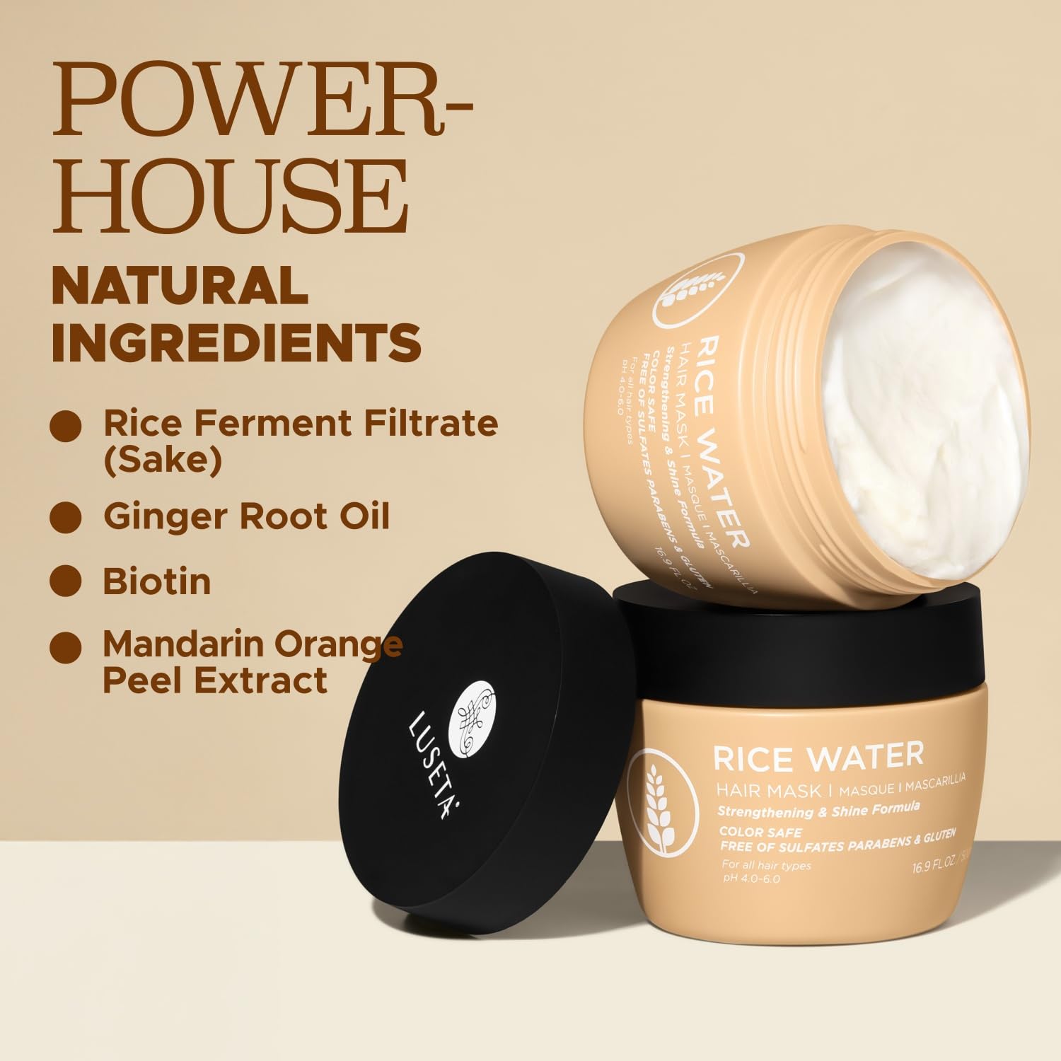 Strengthen & Nourish: Our rice water hair mask, enriched with Rice Ferment Filtrate (Sake) and Biotin, boosts shine and promotes healthier-looking hair. Gentle yet effective for daily use.