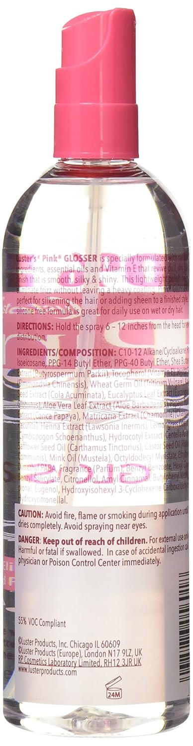 Luster’s pink glosser brilliant shine is formulated with shea butter, jojoba oil, aloe, essential oils and vitamin E that revive dull, dry hair to a finish that is smooth, silky and shiny. This protective lotion and conditioner is designed to protect, condition and restore natural oils and moisture to your hair.