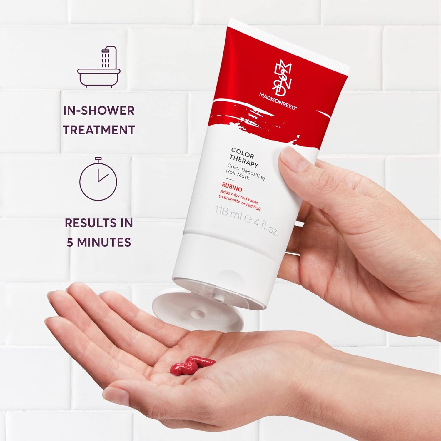 COLOR DEPOSITING HAIR MASK: Madison Reed Color Therapy in Rubino works best on brunette or red hair, and adds ruby red tones to refresh & enhance color. Not intended for gray coverage.