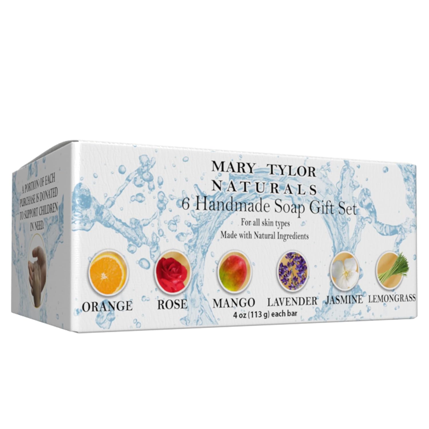 SET INCLUDES 6 (4 oz) SOAP BARS: Orange, Rose, Mango, Lavender, Jasmine, Lemongrass