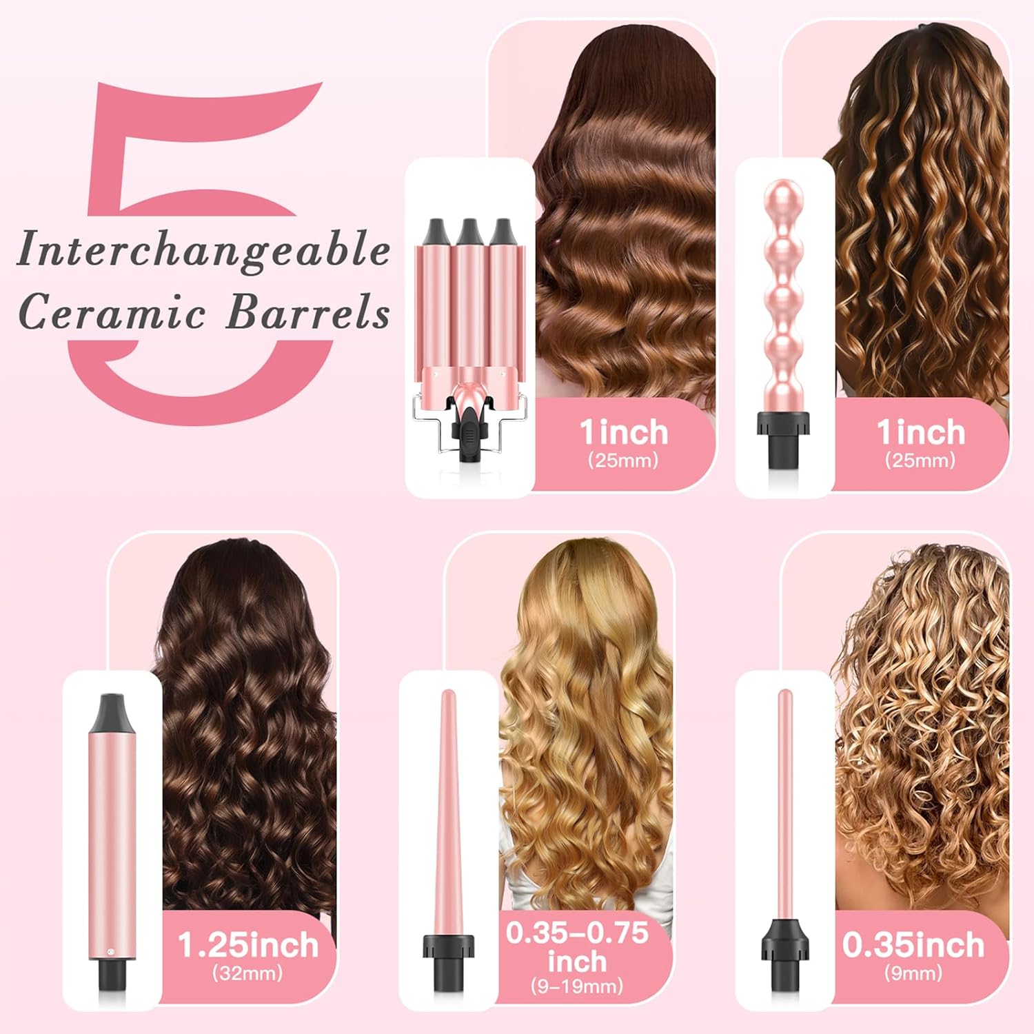 Professional Curling Irons Wand: MOCEMTRY 5 in 1 hair curling wand set comes with 1” hair crimper, 1” bubble curling wand, 0.35” & 1.25” curling wand, 0.35”-0.75” tapered curling wand, unique 30 million negative ions tech-nology will not cause damage to hair. Customize your curls with hair waver 3 barrel and 4 curling wand to switch up your different hairstyles everyday, it’s an excellent gift for girls and women