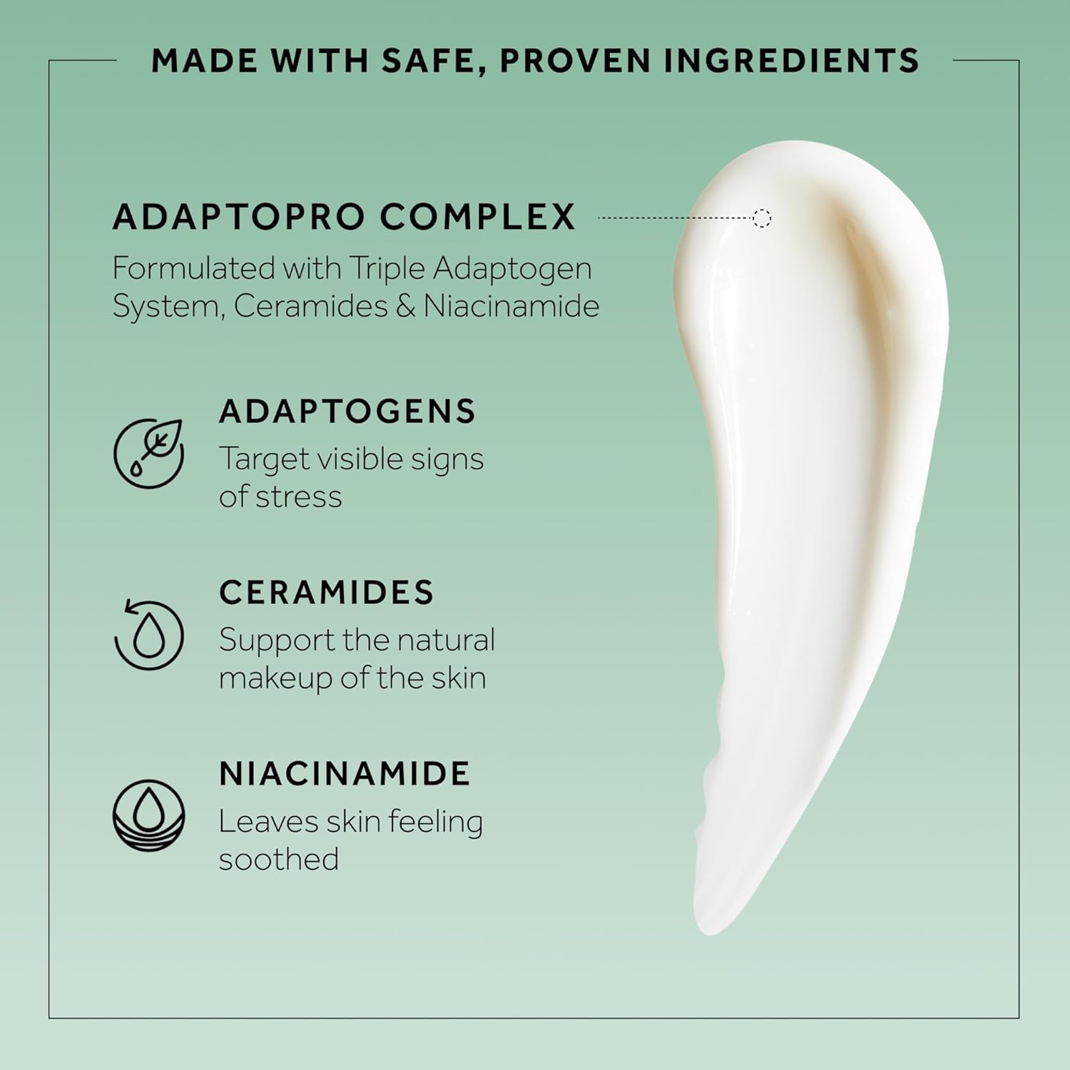 Moisture Barrier – Powered by our Adaptopro Complex blend of Ceramides, Niacinamide and Adaptogens, this facial moisturizer helps support the skin’s delicate moisture barrier. Our ceramide moisturizer supports the natural makeup of the skin, leaving it feeling comforted and soothed.