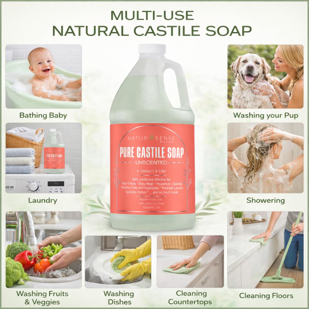 ORGANIC CASTILE SOAP LIQUID, UNSCENTED MULTI PURPOSE CLEANER: NaturSense Castile Soap is a pure liquid castile soap made with organic coconut oil, olive oil, jojoba oil, argan oil, and castor oil. Use as a body wash, face cleanser, shampoo, hand soap, or natural household cleaner.