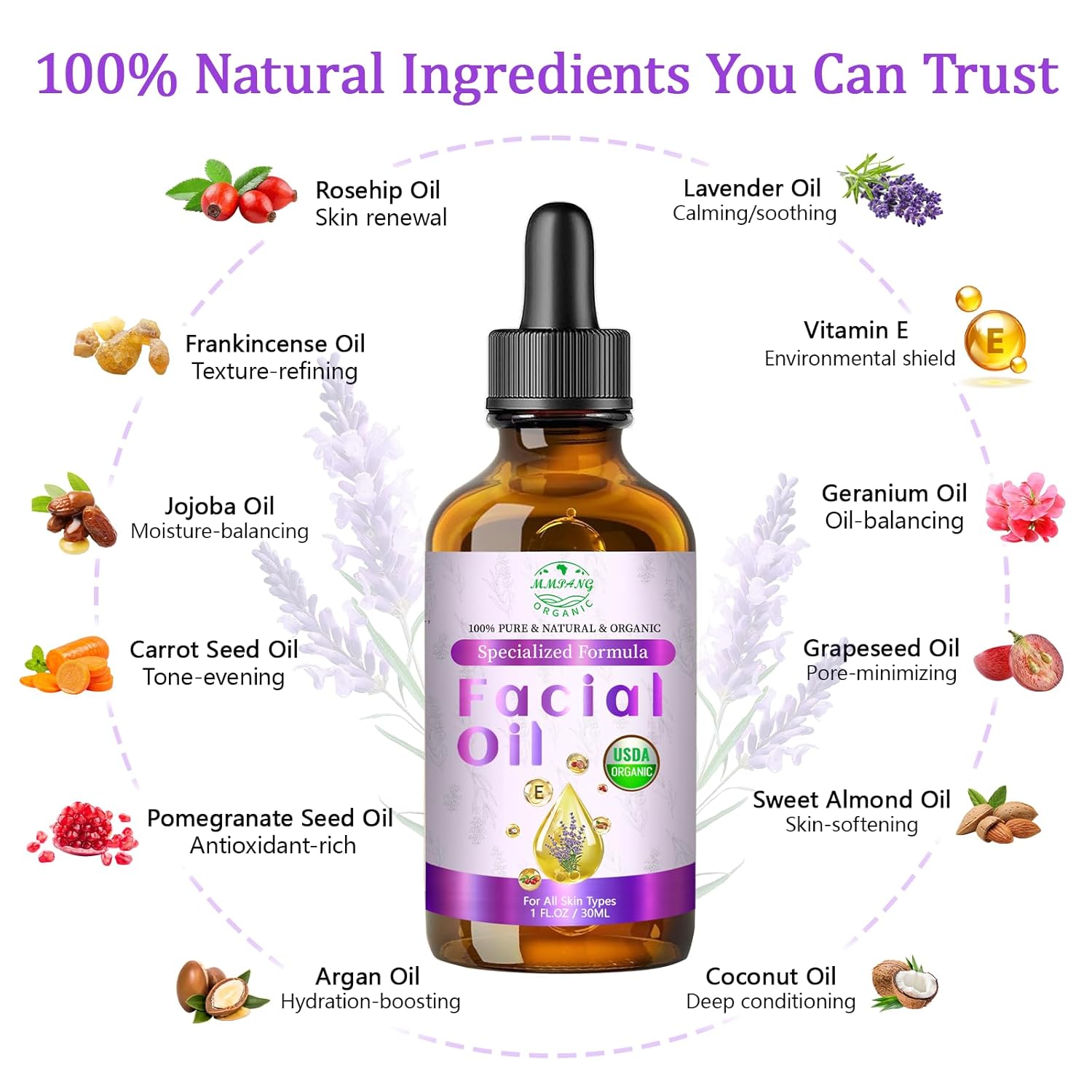 🌿 12-Plant Botanical Complex – Formulated exclusively with plant-derived extracts: Rosehip (skin renewal), Jojoba (moisture-balancing), Lavender (calming/soothing), Frankincense (texture-refining), Carrot Seed (tone-evening), Pomegranate (antioxidant-rich), Geranium (purifying), Grape Seed (pore-minimizing), Sweet Almond (skin-softening), Argan (hydration-boosting), Coconut (deep conditioning), and Vitamin E (environmental shield).