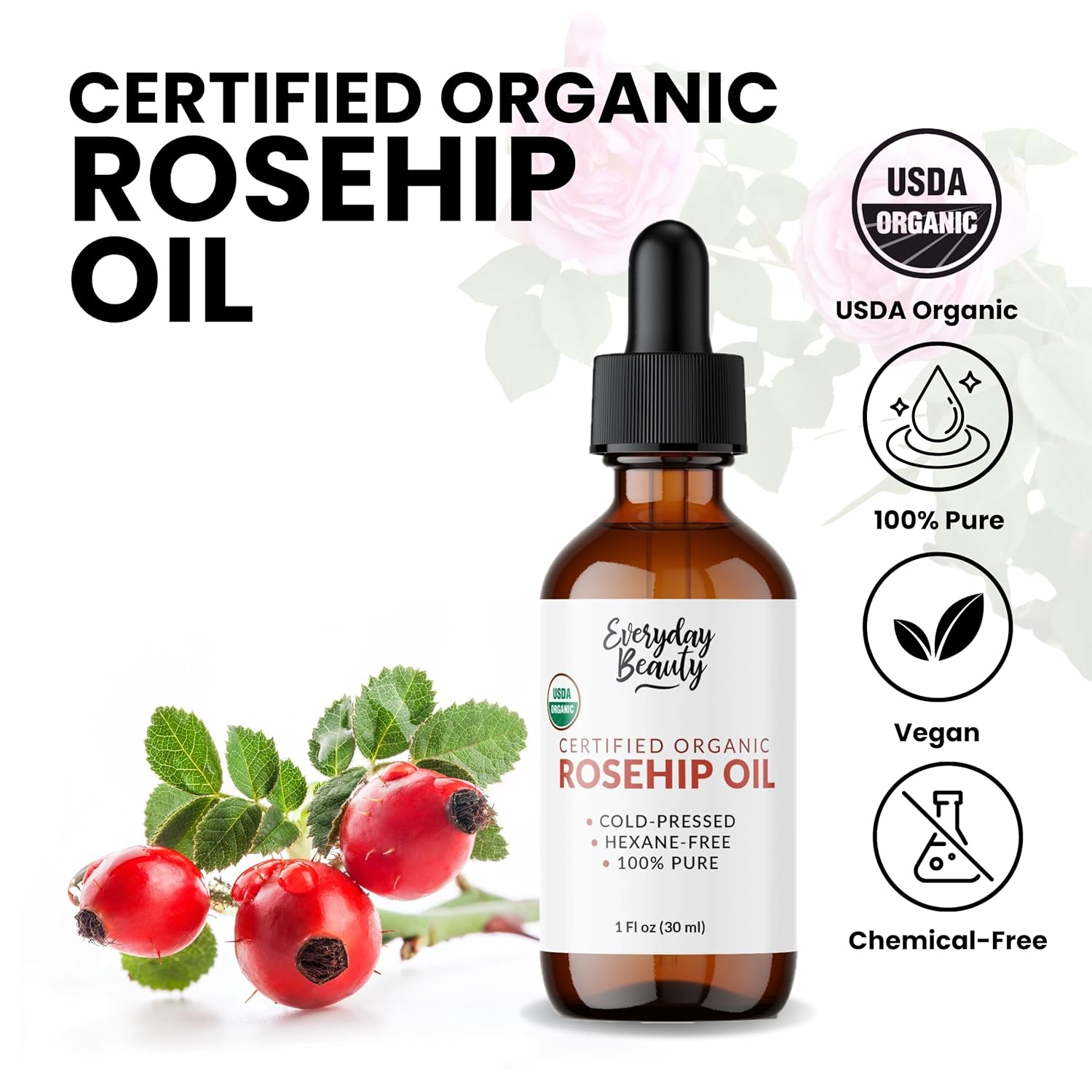 100% Pure & USDA Certified Organic – Our rosehip oil is extracted from the seeds of Rosa canina using a cold-pressed, unrefined process that retains its full nutritional profile. Certified organic and free from additives, chemicals, or synthetic ingredients.