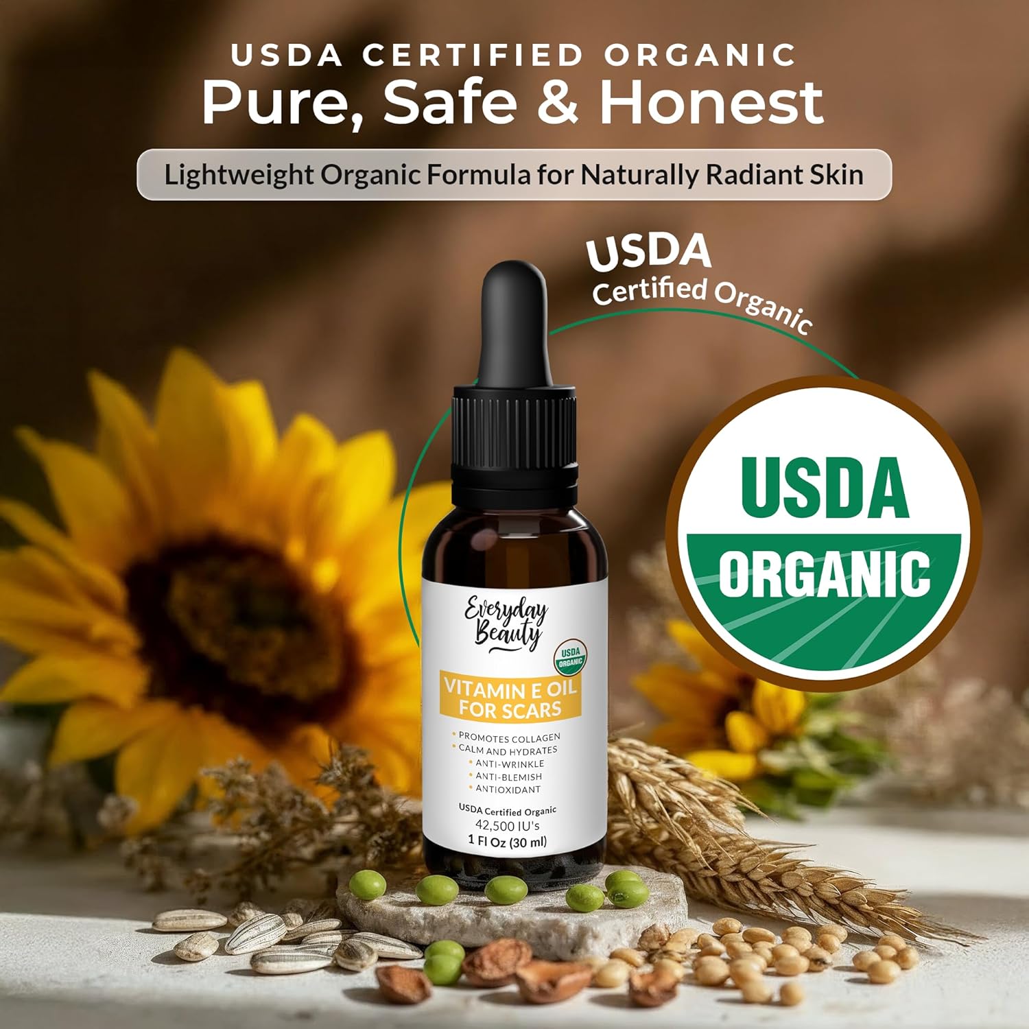 USDA Certified Organic – Experience the quality of Certified Organic Vitamin E Oil for Scars, thoughtfully sourced and crafted without GMO’s, synthetic additives, pesticides, or harsh chemicals. Enjoy a truly natural & organic skincare solution that’s safe and gentle for even the most sensitive skin types.