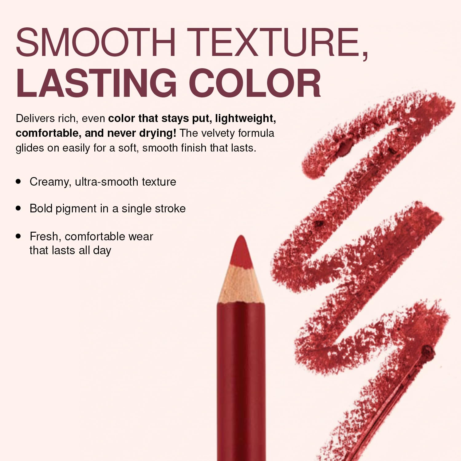 FORMULATION/ BENEFITS: Formulated with sensitive skin in mind, our lip liner pencil features a gentle formula infused with Vitamin E for all-day wear.