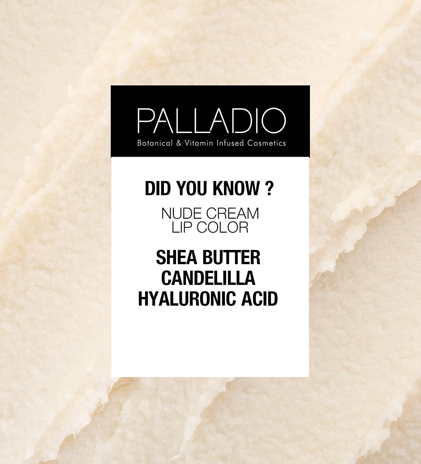 FORMULATION/ BENEFITS: This long-wearing nude color lipstick is formulated to hydrate lips with infused ingredients like shea butter and hyaluronic acid.