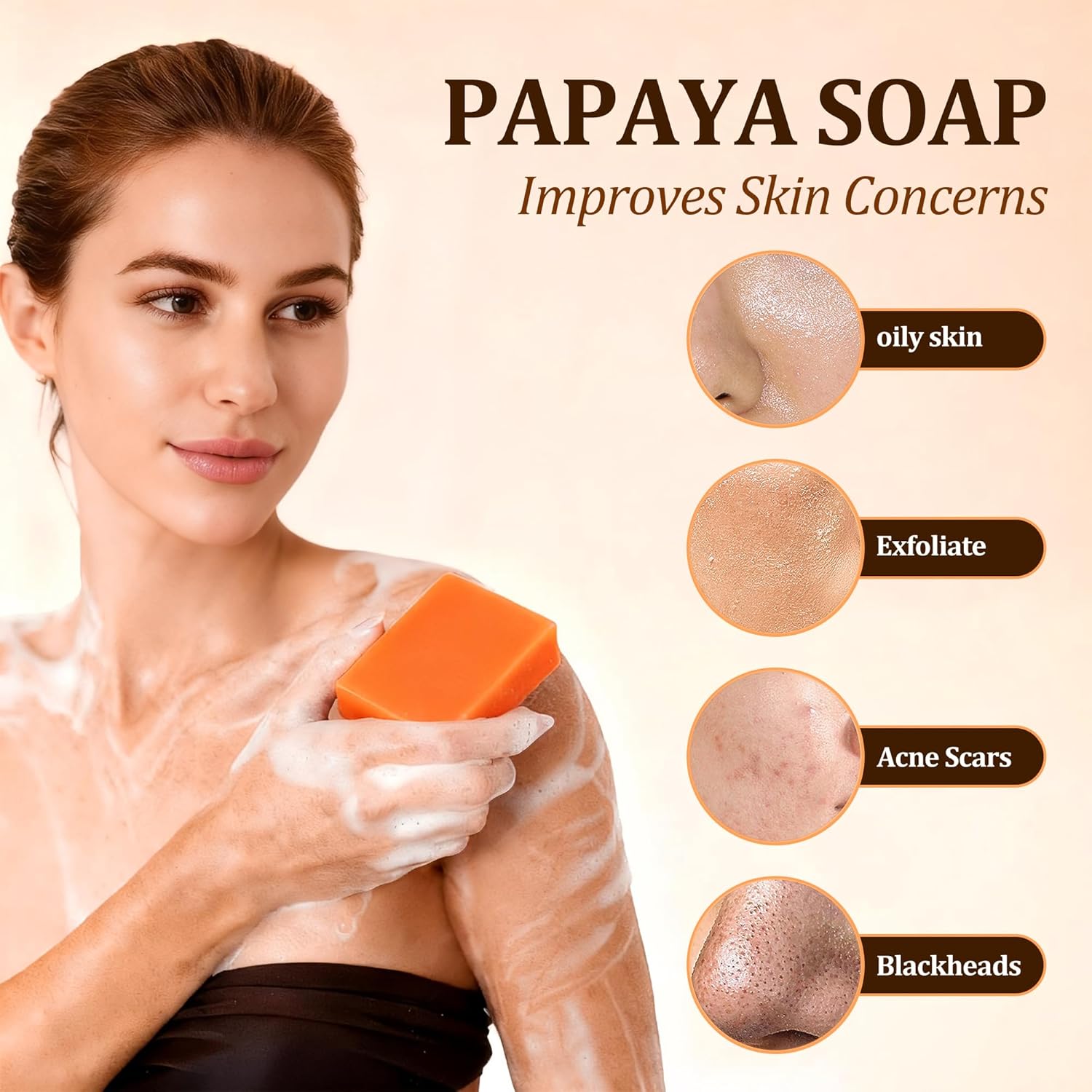 NATURAL PAPAYA SOAP FOR SENSITIVE SKIN: Crafted with powerful extracts like Olive Oil, Shea Butter, Aloe Vera, Papaya, and Ginger, our Natural soap delivers a comprehensive skincare experience. It works to deeply hydrate and lock in moisture, while gently unclogging pores and refining skin texture for a smoother feel. Plus, the soothing power of Aloe Vera and Ginger helps calm irritation and boost healthy circulation, leaving your complexion incredibly soft, supple, and visibly revitalized