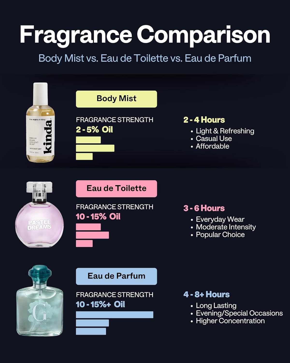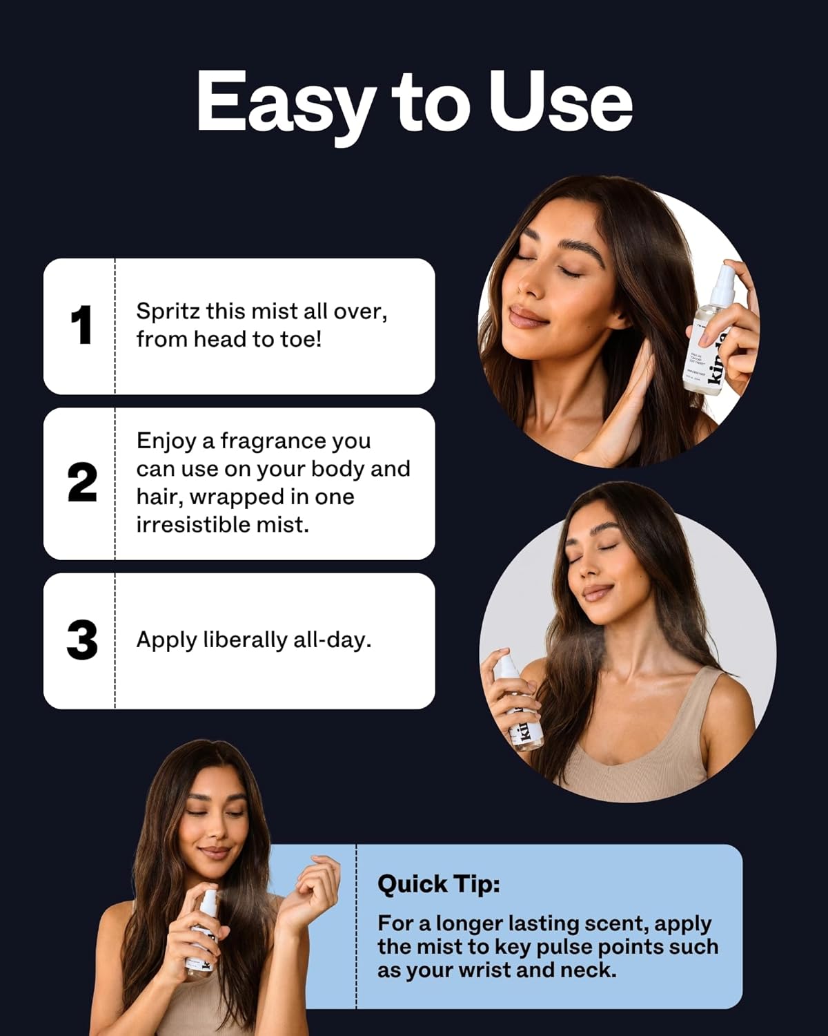 KINDA HAIR & BODY MISTS – 8.6 fl.oz / 255 mL Experience a versatile fragrance you can enjoy on both hair and body. Each KINDA mist is crafted with 4% oil concentration and moisturizing ingredients to leave your hair and skin delicately scented while feeling soft and nourished. Lightweight and refreshing, this hair and body mist is designed for easy reapplication throughout the day. Fragrance typically lasts 2–4 hours depending on environment and activity, making it perfect for daily wear or on-the-go moments. Each variant showcases a unique scent profile inspired by popular fragrances, combining carefully blended notes for a sophisticated, modern experience. Spritz lightly on hair and skin whenever you want to refresh your fragrance and elevate your routine. INGREDIENTS: ALCOHOL DENAT., AQUA/WATER/EAU, FRAGRANCE/PARFUM, PEG-40 HYDROGENATED CASTOR OIL, COCOS NUCIFERA (COCONUT) OIL, BRASSICA OLERACEA ITALICA (BROCCOLI) SEED OIL, GLYCERIN, PANTHENOL, TOCOPHEROL ACETATE, ETHYLHEXYL SALICYLATE, BUTYL METHOXYDIBENZOYLMETHANE, ETHYLHEXYL METHOXYCINNAMATE, DICAPRYLYL ETHER, AMYL CINNAMAL, BENZALDEHYDE, BENZYL BENZOATE, BENZYL CINNAMATE, EUGENOL, GERANYL ACETATE, ISOEUGENOL, LIMONENE, LINALOOL, LINALYL ACETATE, ROSE KETONES, TETRAMETHYL ACETYLOCTAHYDRONAPHTHALENES, TRIMETHYLCYCLOPENTENYL METHYLISOPENTENOL, VANILLIN.