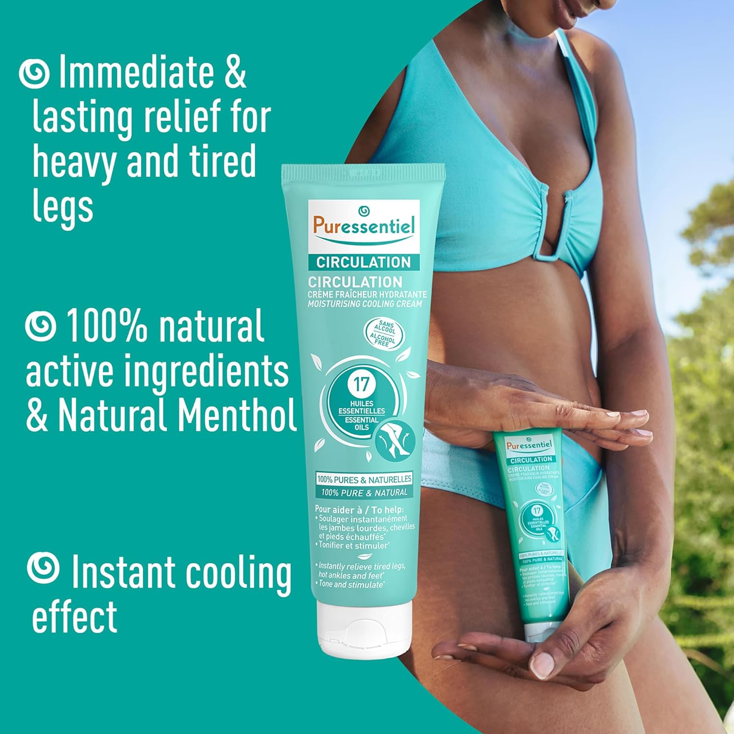 The Puressentiel Circulation Moisturising Cooling Cream contains 17 essentials oils, 100% pure and natural. Its 99.5% natural formula supports circulation. Alcohol-free and non-drying, this moisturising and nourishing cream can be used daily, making for a relaxing massage and providing instant and lasting relief for tired legs, hot feet, and sore ankles. Its non-greasy, non-sticky texture is rapidly absorbed.