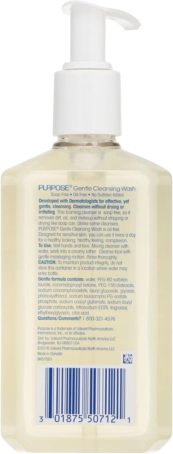 PURPOSE Gentle Cleansing Wash is a dermatologist-developed formula that provides a gentle yet effective cleansing experience. Soap-free, oil-free, and sulfate-free, this foaming cleanser lifts away dirt, oil, and makeup without over-drying or irritating the skin. Designed to be as gentle as water, it is ideal for sensitive skin and can be used twice daily to maintain a fresh, clean complexion. The lightweight, easy-rinsing formula ensures a comfortable cleansing experience without residue.