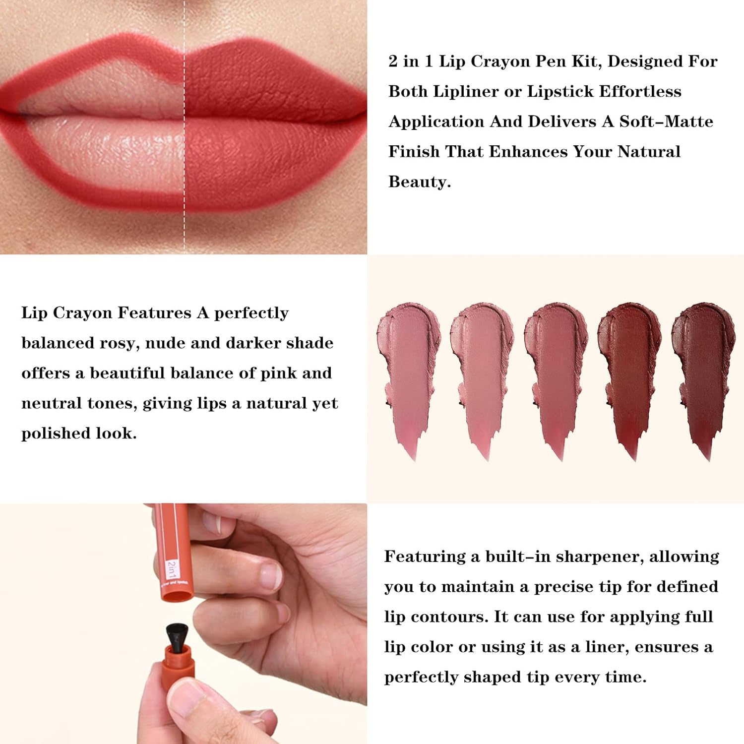 Elevate your everyday lip look with this 2 in 1 lip crayon pen kit, a perfect blend of precision, comfort, and long-lasting color. it also features a built-in sharpener, allowing you to maintain a precise tip for defined lip contours. Designed for effortless application and delivers a soft-matte finish that enhances your natural beauty.