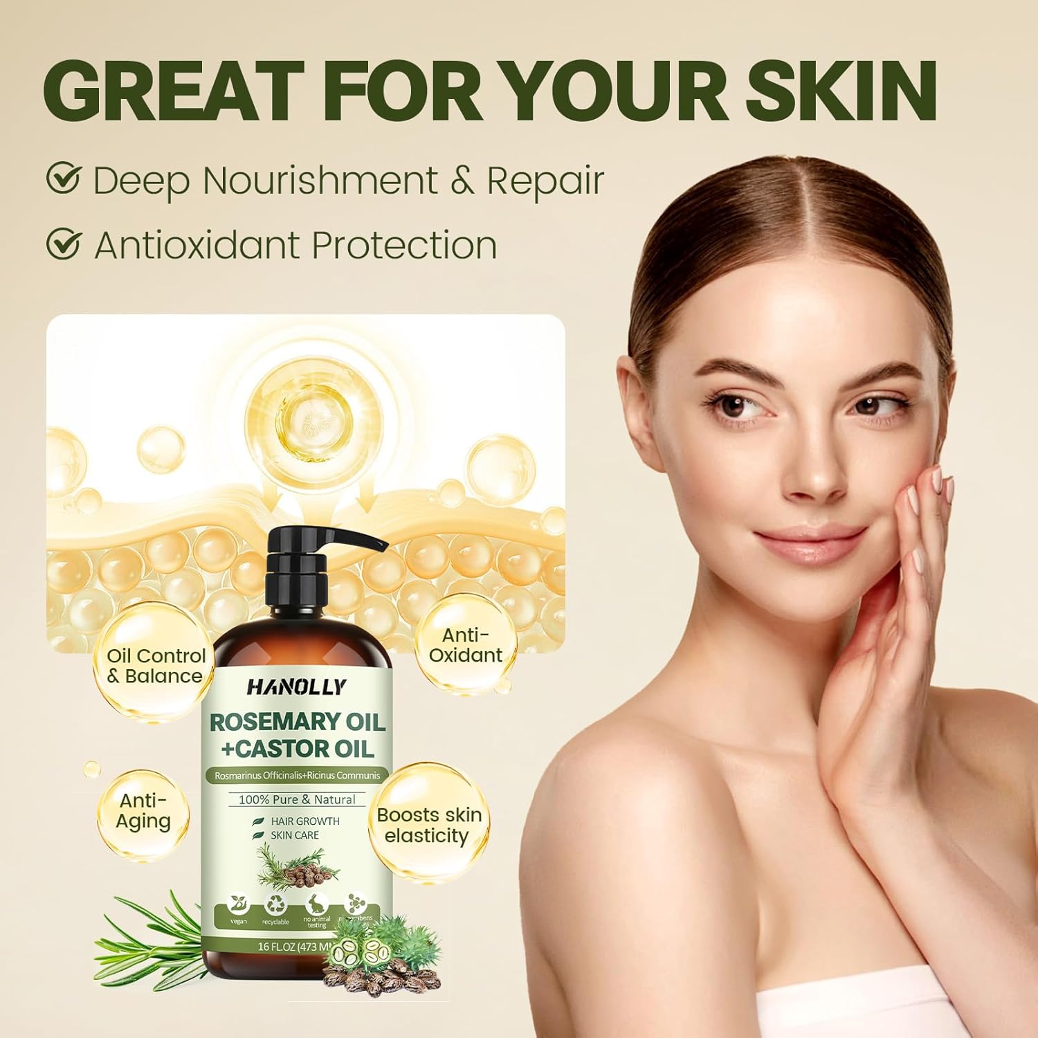 🌿REVIVE HAIR GROWTH WITH ROSEMARY & CASTOR OIL: Hanolly’s 16oz hair oil combines cold-pressed castor oil and rosemary oil for hair growth to awaken dormant follicles. This powerful duo stimulates blood flow to the scalp, delivering nutrients that strengthen roots and visibly reduce shedding.
