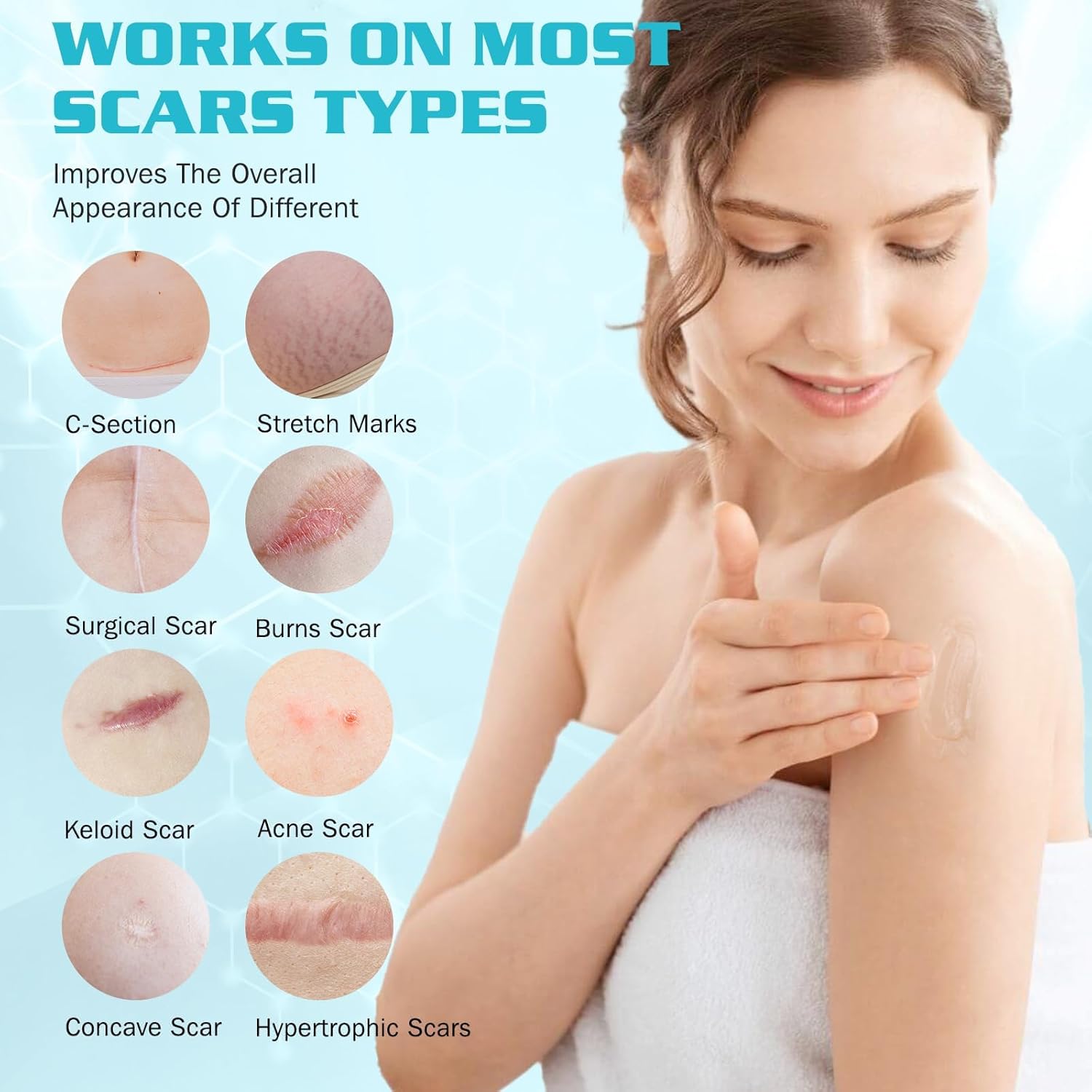 Fade Scoars, Say Goodbye To Scoars: This product can effectively fade all kinds of scars, such as: acne scars, post-operative scars, obesity lines, burn scars, etc.; It is suitable for all parts of the body, such as: face, legs, abdomen, hands, back, etc., and is also suitable for all skin types, with continued use, the swelling will subside, the color of the scars will be faded, and the texture of the skin will be made smoother to achieve a restorative effect.