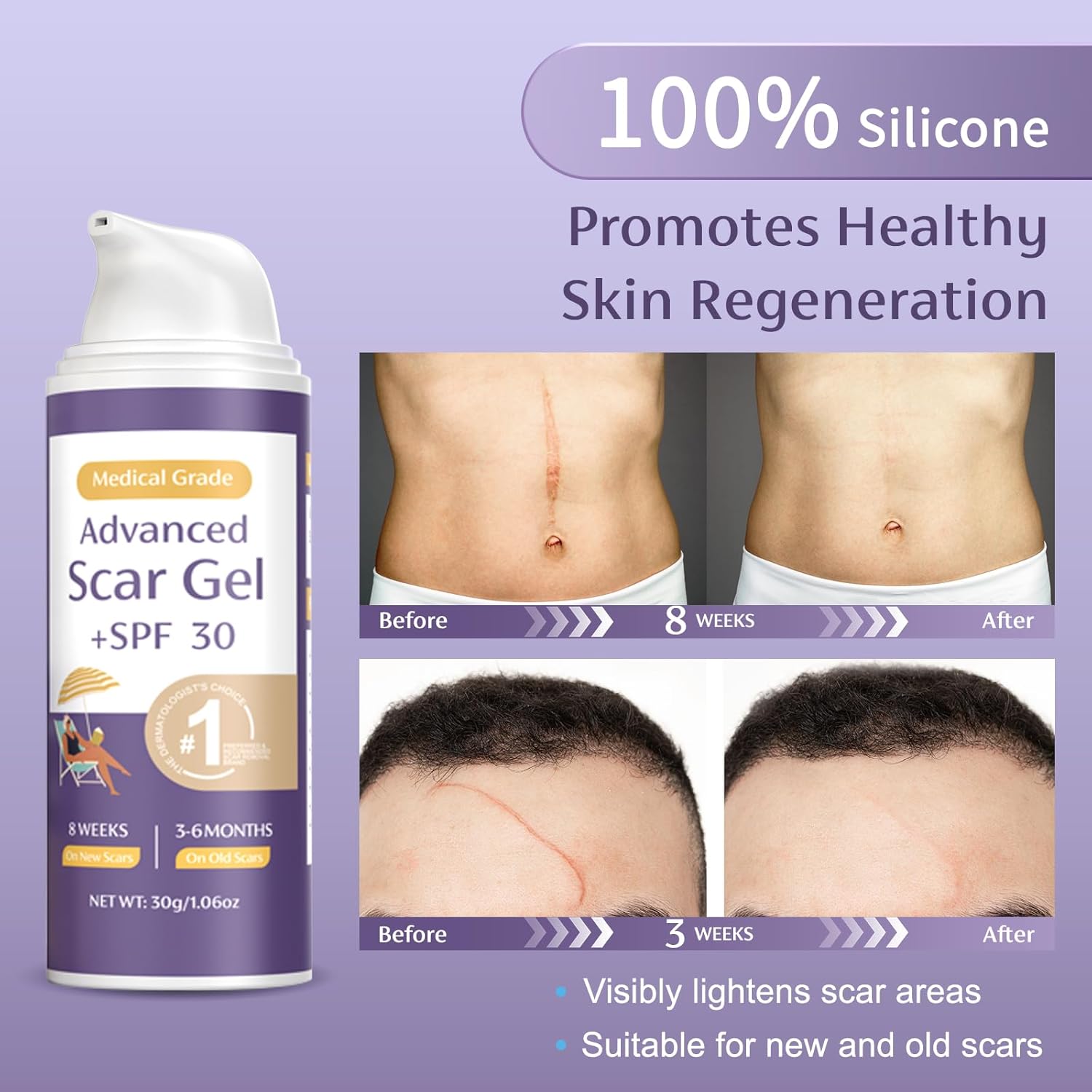 【Scar Cream with SPF 30】 This silicone scar gel contains 100% medical-grade silicone, which helps reduce the appearance of stretch marks, surgery scars, burns, injuries, acne, keloids, and more. It also moisturizes scar tissue, resulting in smoother, more radiant skin