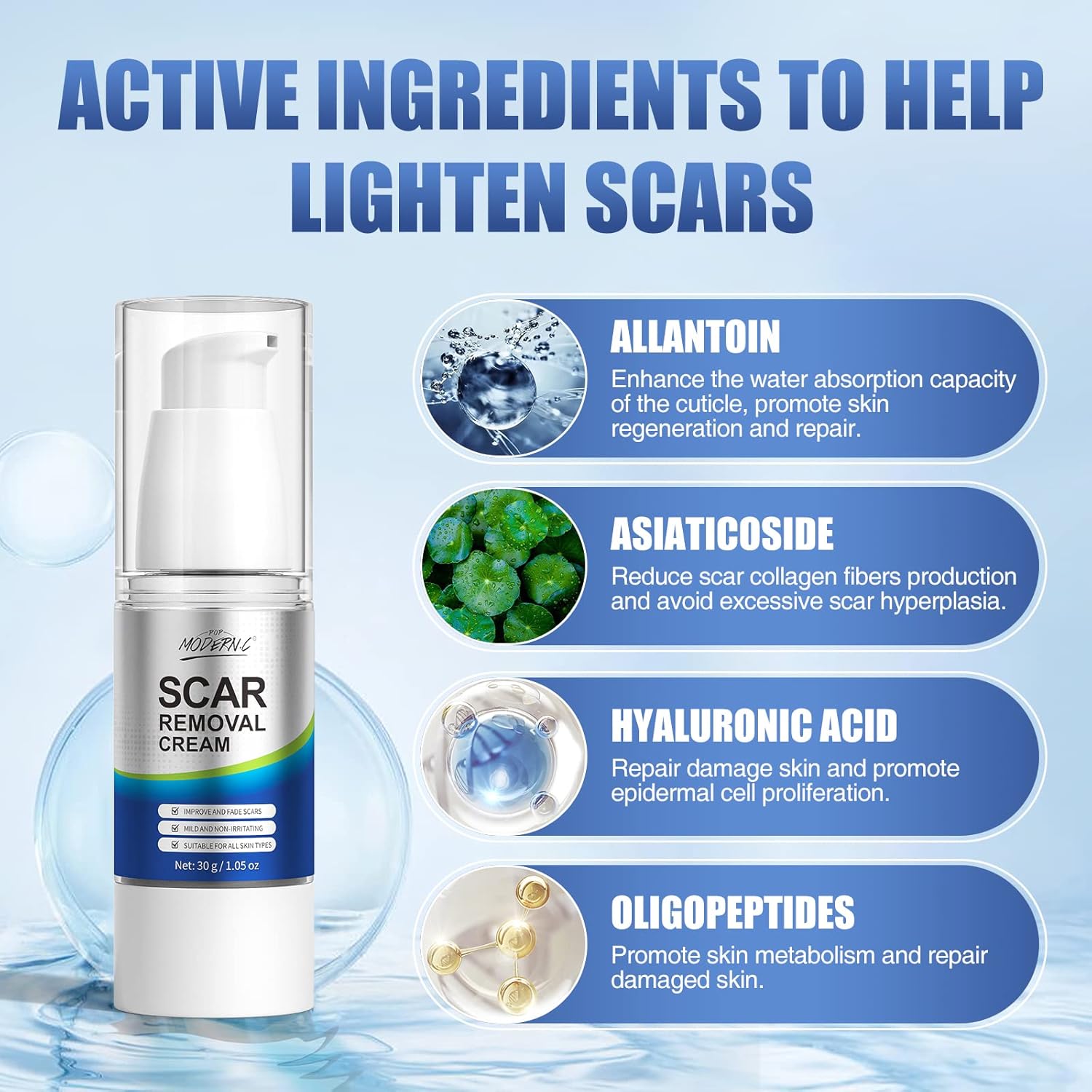 NATURAL GENTLE INGREDIENTS: Our scar cream including effective plant ingredients, which is gentle and does not hurt the skin, bringing the best care to your skin. Rich in active ingredients such as asiaticoside, allantoin, hyaluronic acid and oligopeptide, it can help skin repair while effectively fade scars, so that you can say goodbye to scars and show your beauty with confidence.