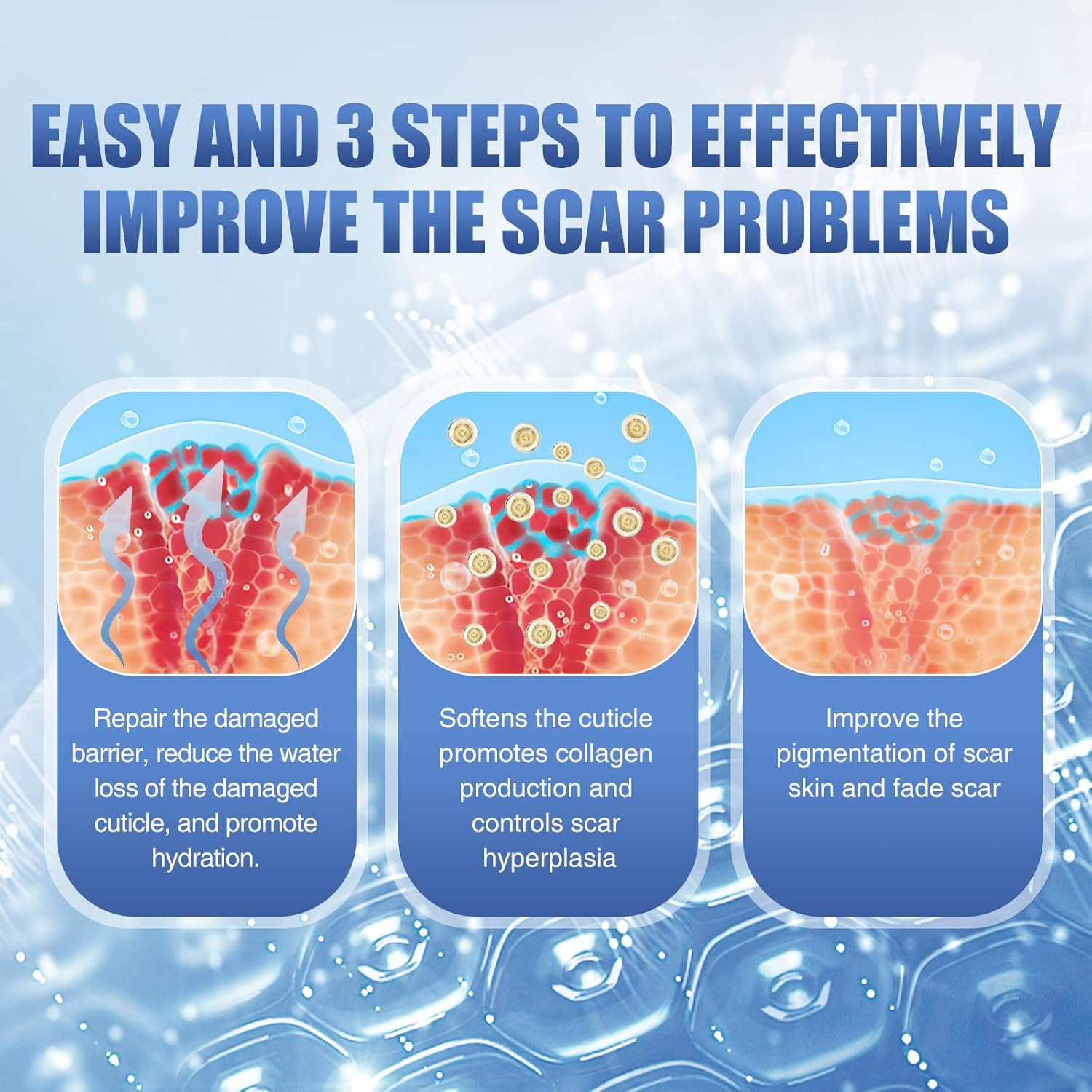 EFFECTIVE FORMULA: Our scar removal creams are carefully formulated to improve the appearance, texture and shape of scars. Scar cream can effectively repair damaged skin barrier and form a protective layer, reduce water from escaping and promoting collagen production, effectively reduce pigmentation and fade scars.