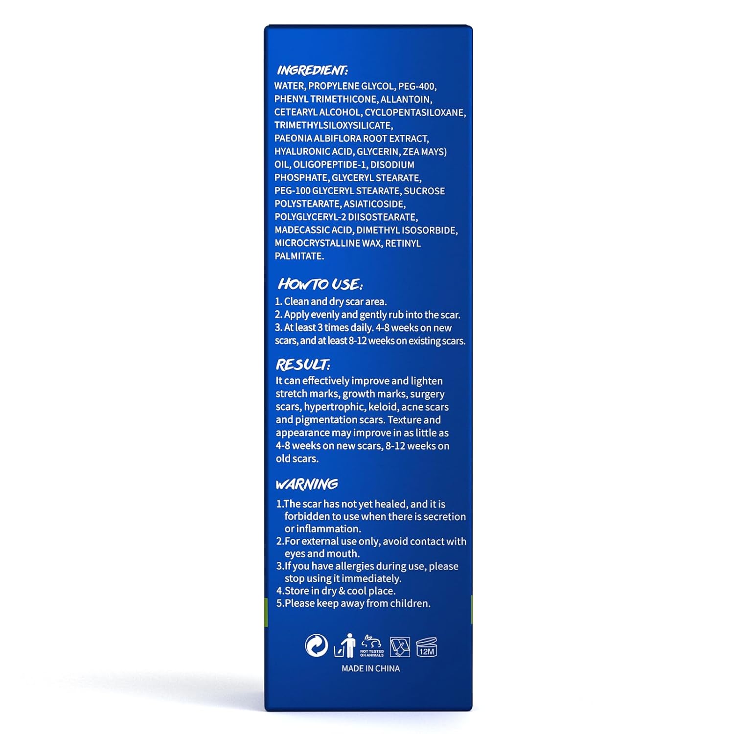 VISIBLY TESTED RESULTS: The test data indicates that our scar cream is used three times a day, and you can see results quickly. It can effectively lighten new scars in 4-8 weeks, and old scars in 8-12 weeks. The size and depth of the scar will affect the effect, please keep using it and you will see significant changes.