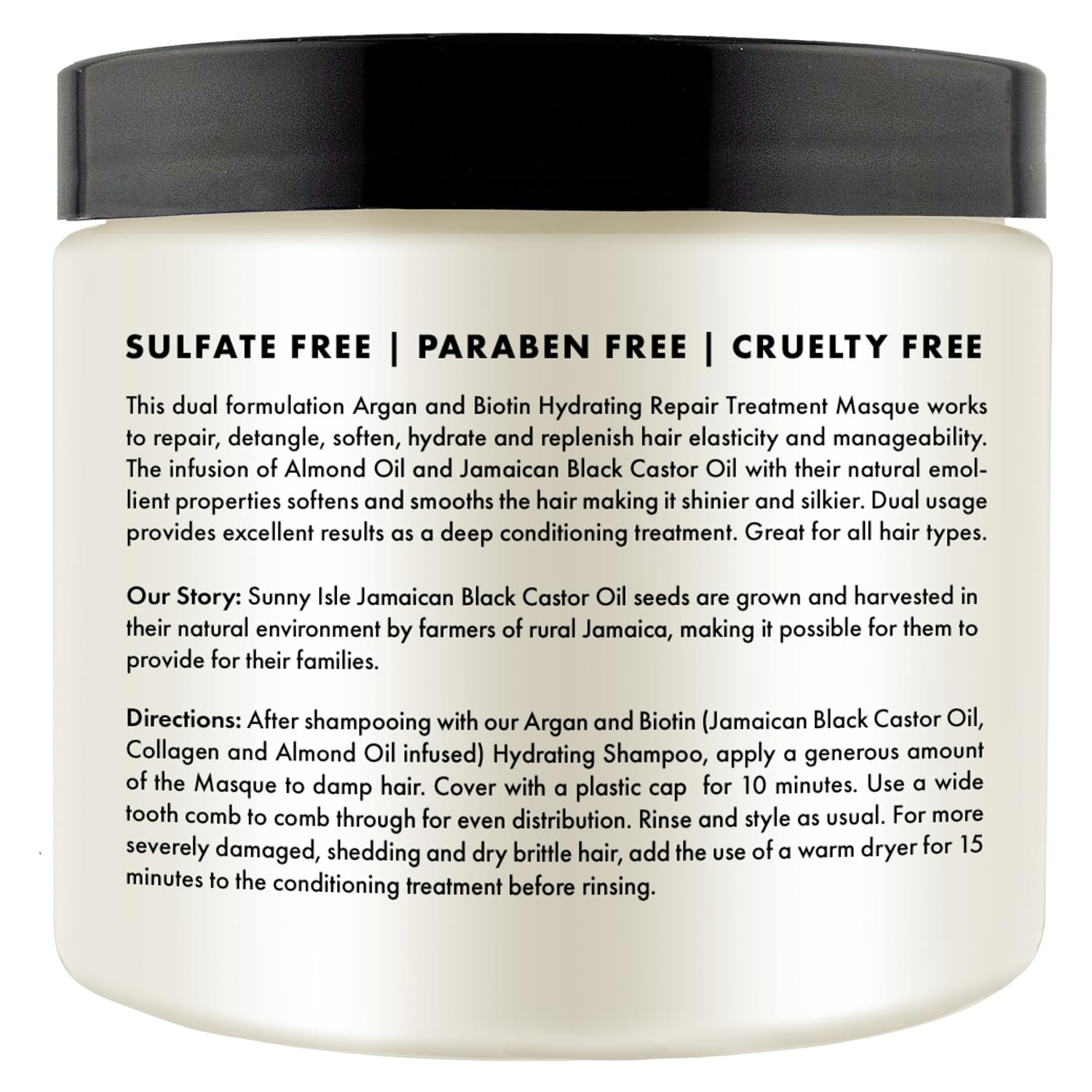 Sunny Isle’s rich formula Argan & Biotin Deep Hydrating Intensive Repair Masque delivers powerful moisture, strength, and restoration for dry, damaged, or breakage-prone hair. This dual-action formula blends Biotin, Argan Oil, Almond Oil, and Jamaican Black Castor Oil to deeply hydrate, detangle, and improve elasticity for smoother, more manageable strands. Biotin supports stronger, thicker-feeling hair, while nutrient-rich oils restore softness, shine, and lasting moisture to help reduce breakage.