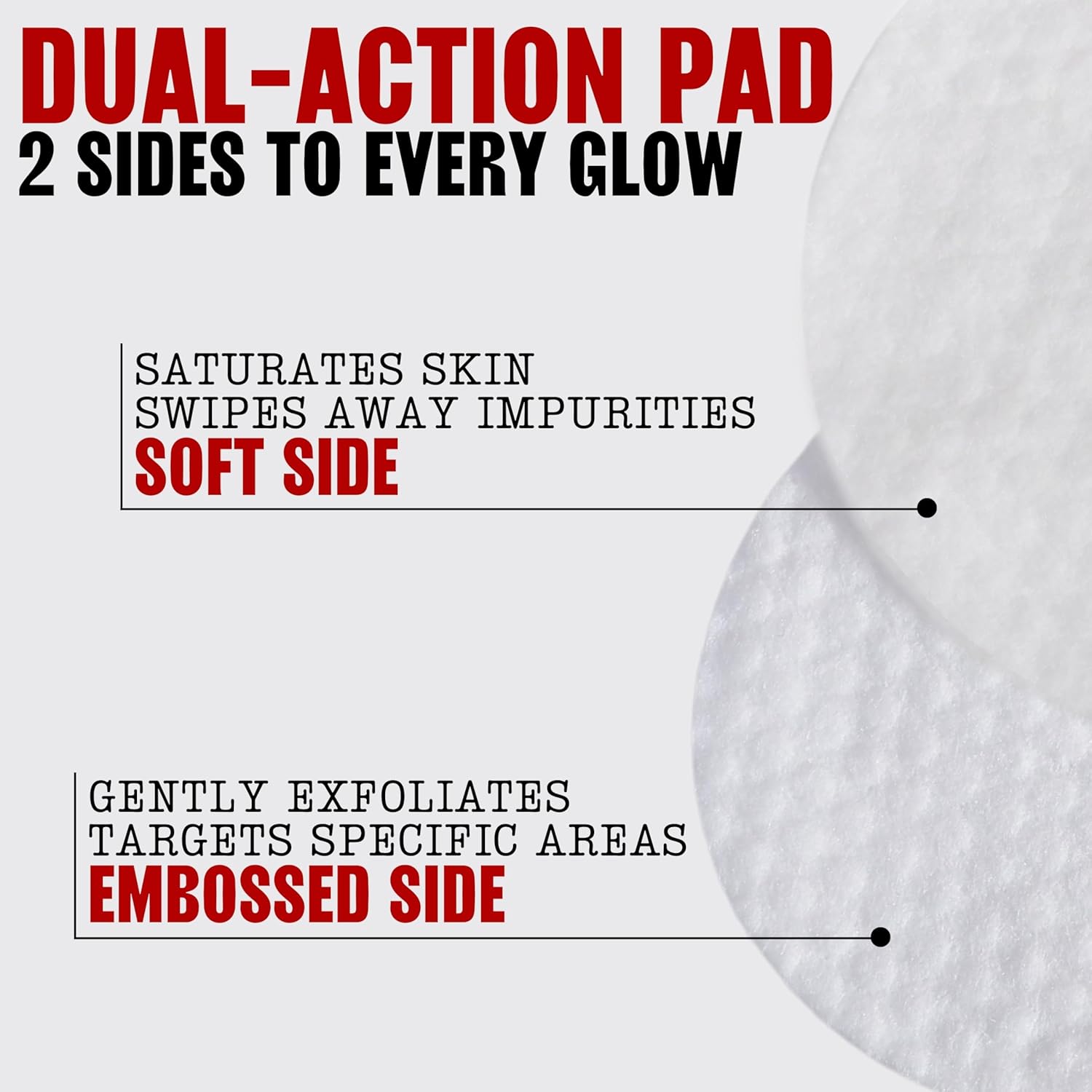 Dual-Action Facial Pads: Dual sided toner pads feature a smooth and embossed side. The smooth side of these face pads saturates skin and swipes away impurities. Embossed side provides gentle exfoliation as a face exfoliator on targeted areas