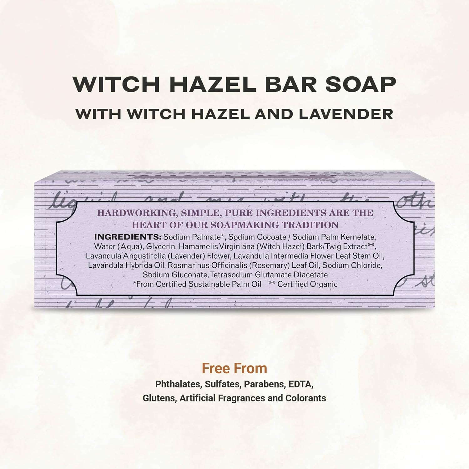 WITCH HAZEL BAR SOAP A balanced blend of organic witch hazel and lavender offer an astringent cleaning formula that gently tones and rejuvenates. Its subtle earthy scent soothes, softened by delicate notes of fresh lavender.