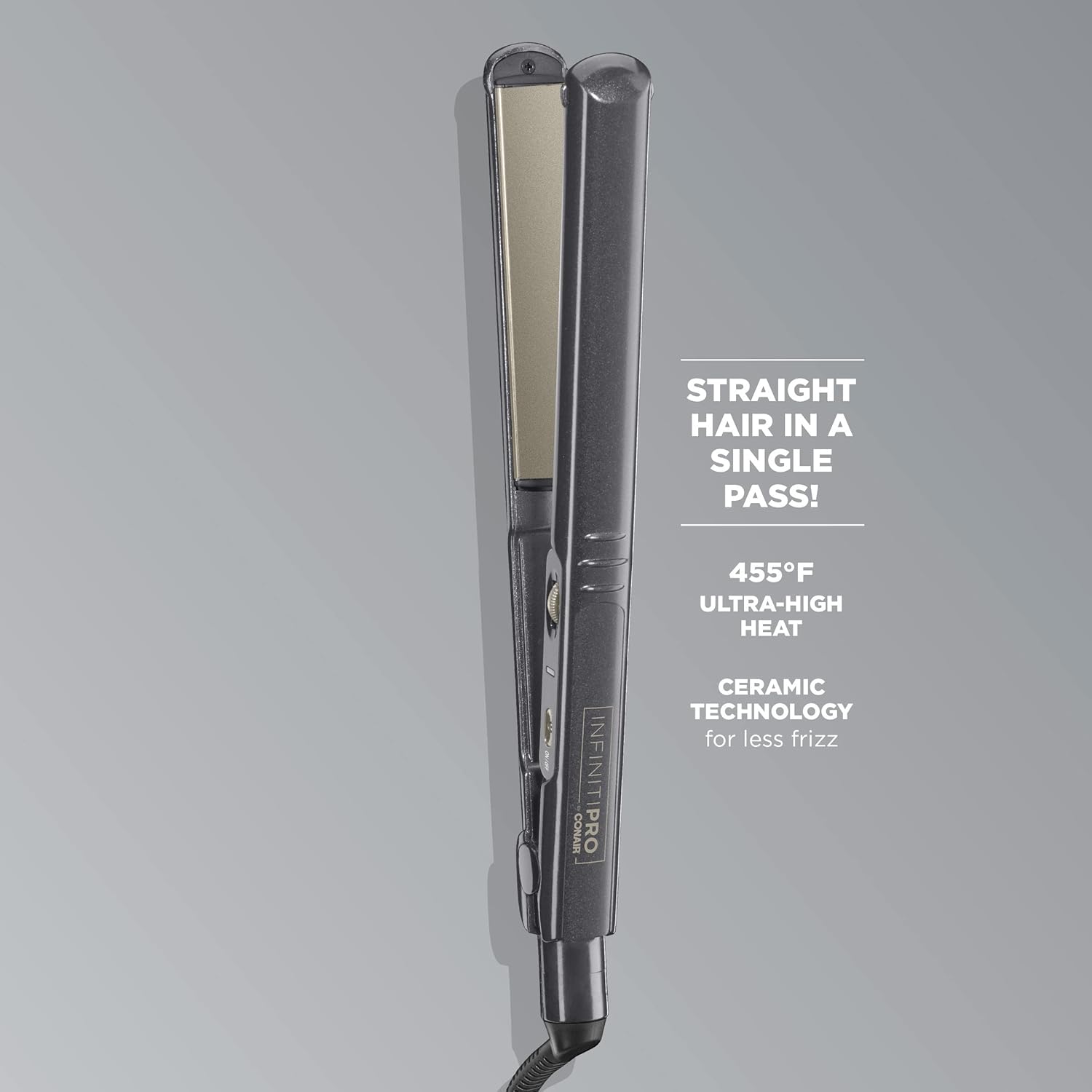 Create gorgeous smooth, shiny straight hair with the INFINITIPRO BY CONAIR Tourmaline Ceramic 1-inch Flat Iron. This flat iron makes it easy to get salon straight hair at home. The tourmaline ceramic coated plates provide even heat to minimize damage for less frizz and shiny, healthy-looking hair. With 15-second heat-up to an ultra-high 455 degrees F (230 degrees C) and variable heat settings, this professional quality hair straightener lets you style quickly and efficiently. No more waiting around for your hair straightener or flat iron to heat up! It reaches high enough heat to turn even the most out-of-control hair into shiny, smooth and soft tresses. Extra-long floating plates make it easy to style quickly and you can even use it to create wavy curls with a flick of your wrist. Tourmaline Ceramic technology provides both anti-frizz and anti-static results with less damage than other traditional straightening irons. This model features convenient auto-off to if the flat iron is left on too long. For a high performance flat iron with professional capabilities, this INFINITIPRO BY CONAIR Tourmaline Ceramic 1-inch Flat Iron is the right tool for you. As compared to typical straightener plate length of 85mm.