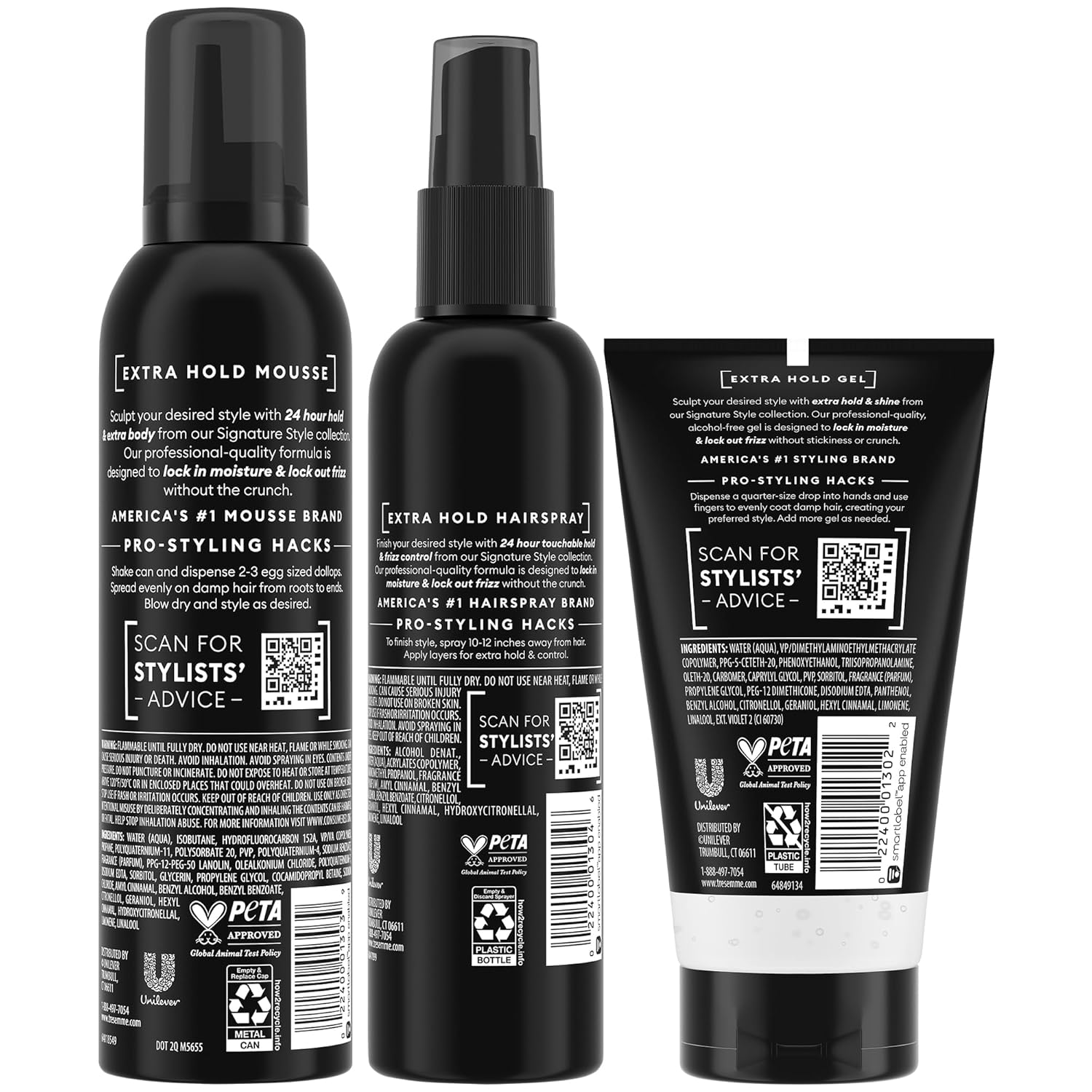 SOFT, CRUNCH-FREE STYLES: For touchable hold that’s never sticky or crunchy, the TRESemme Extra Hold bundle includes must-have hair care essentials: Hair Mousse (6.5 oz), Hairspray (6 oz), and Hair Gel (5 oz).