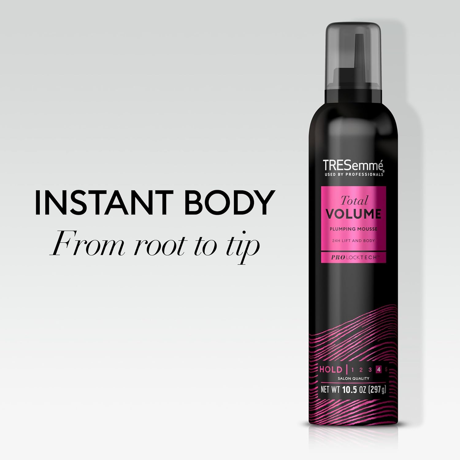 Turn up the volume with TRESemmé’s Total Volume Plumping Mousse! This unique volumizing formula gives your hair’s body a major boost without weighdown. From blowouts to voluminous waves, get the all-day hold and volume to reach your hair goals. Formulated with Pro Lock Tech, our 24HR plumping mousse ensures that your hair is never flat or dull. This lush foaming mousse works in tandem with your heat styling tools to give you body and bounce, so you can create weightless volume that’s never sticky or stiff. Reach your hair goals with volume you can count on—from root to tip. Perfect your defiant volume in 3 easy steps. Prep with Total Volume Shampoo and Conditioner, then style with Total Volume Mousse. Start by shaking the can and dispensing 2 to 3 dollops of mousse into the palms of your hands. Spread evenly into hair before styling for major volume and smooth body. Finish with Total Volume Hairspray. Since 1948, TRESemmé has been dedicated to providing professional-quality results to empower YOU to express your style. Our unique formulas are PETA-approved and made with carefully selected ingredients, and TRESemmé never tests on animals. We’re always made with intention and inspired by the latest trends and style.
