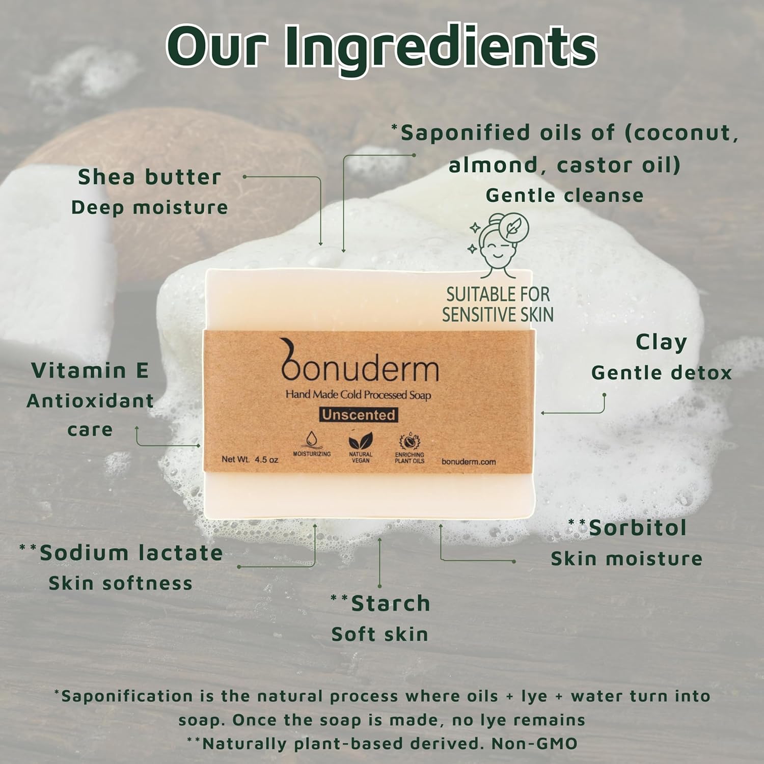 🤍🤍🤍 VEGAN SOAP & NON-TOXIC BODY SOAP – Switch to a non toxic soap bar free from harsh chemicals, sulfates, parabens, and synthetic additives. Our vegan handmade bar soap is crafted with plant-based oils like coconut, almond, and castor and made without added fragrances, providing a gentle and unscented body soap for a cleaner, healthier skincare routine. Bonuderm’s all natural soap for women and men offers a nourishing cleanse without irritation, making it a perfect choice for sensitive skin.