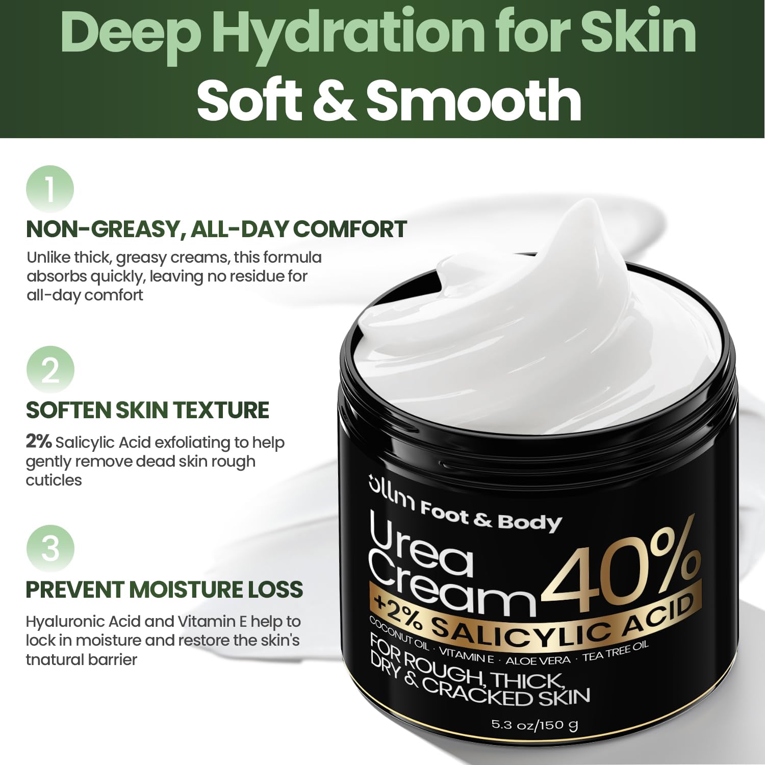 Powerful Hydration & Skin Barrier Repair: Experience deep hydration with our urea cream 40 percent for feet maximum strength, formulated with 40% urea, tea tree oil, coconut oil, aloe vera, vitamin E, and shea butter. This powerful blend restores your skin’s natural moisture barrier, locks in hydration, and targets dry, cracked, and rough skin with long-lasting effects. Cracked hands repair cream is perfect for soothing callus remover for feet, repairing cracked heels, and softening rough feet, leaving your skin smoother, more hydrated, and healthier with regular use