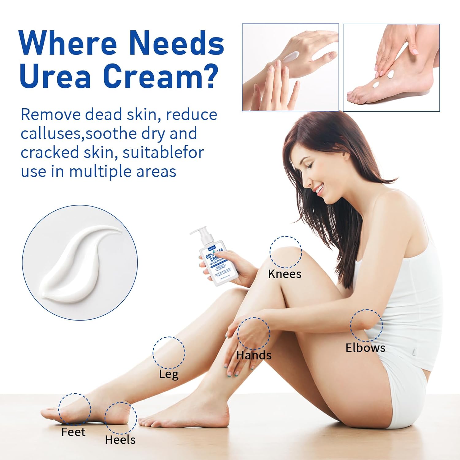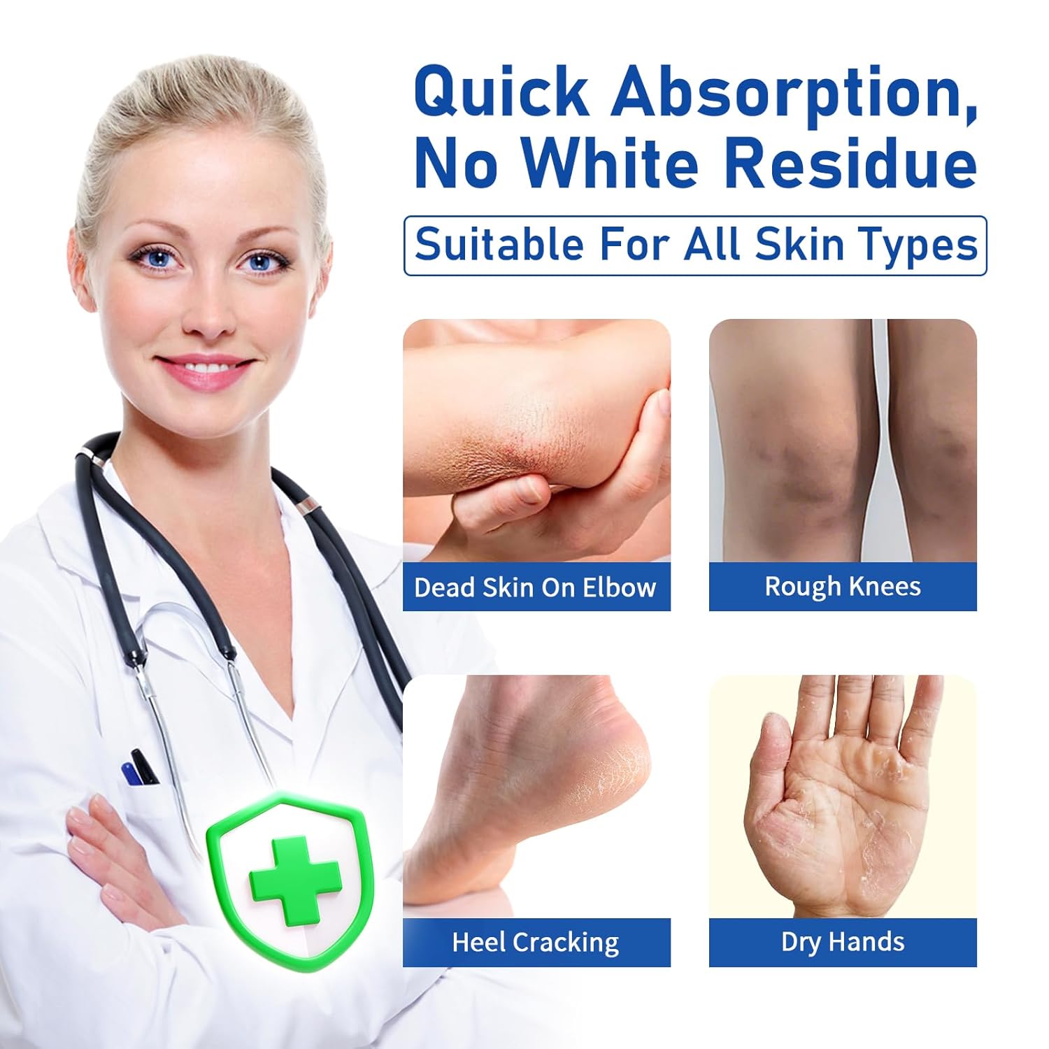 SUITABLE FOR MULTIPLE AREAS, NO WHITE RESIDUE: Urea foot cream combined with exfoliating and hydrating, suitable for dry and cracked feet, knees, elbows, hands and heels. White lotion texture, fast absorption, no white residue, help you improve the problem of dry, cracked and rough skin