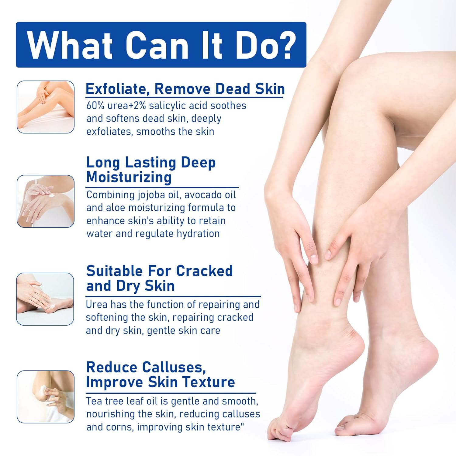 GENTLE FOOT CARE: We are based on 60% urea and rich in other natural plant ingredients. Tea tree leaf oil and aloe can soothe and repair cracked skin, remove dead skin, reduce calluses, while deeply nourishing the skin, smoothing and softening the skin, mild and non greasy with a faint fragrance