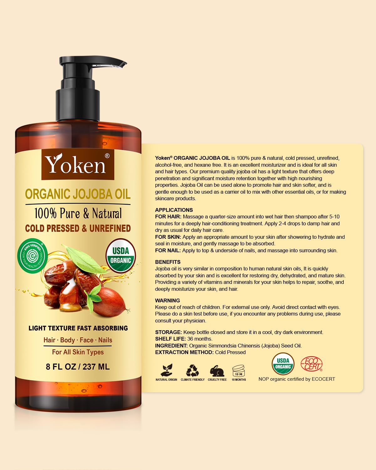 100% Pure & Natural Jojoba Oil: Yoken jojoba oil organic is cold pressed from natural jojoba seeds, extra virgin, and unrefined. Single Ingredient Oil, Chemical Free, Alcohol Free, Parabens Free, Hexane Free, and Cruelty-free