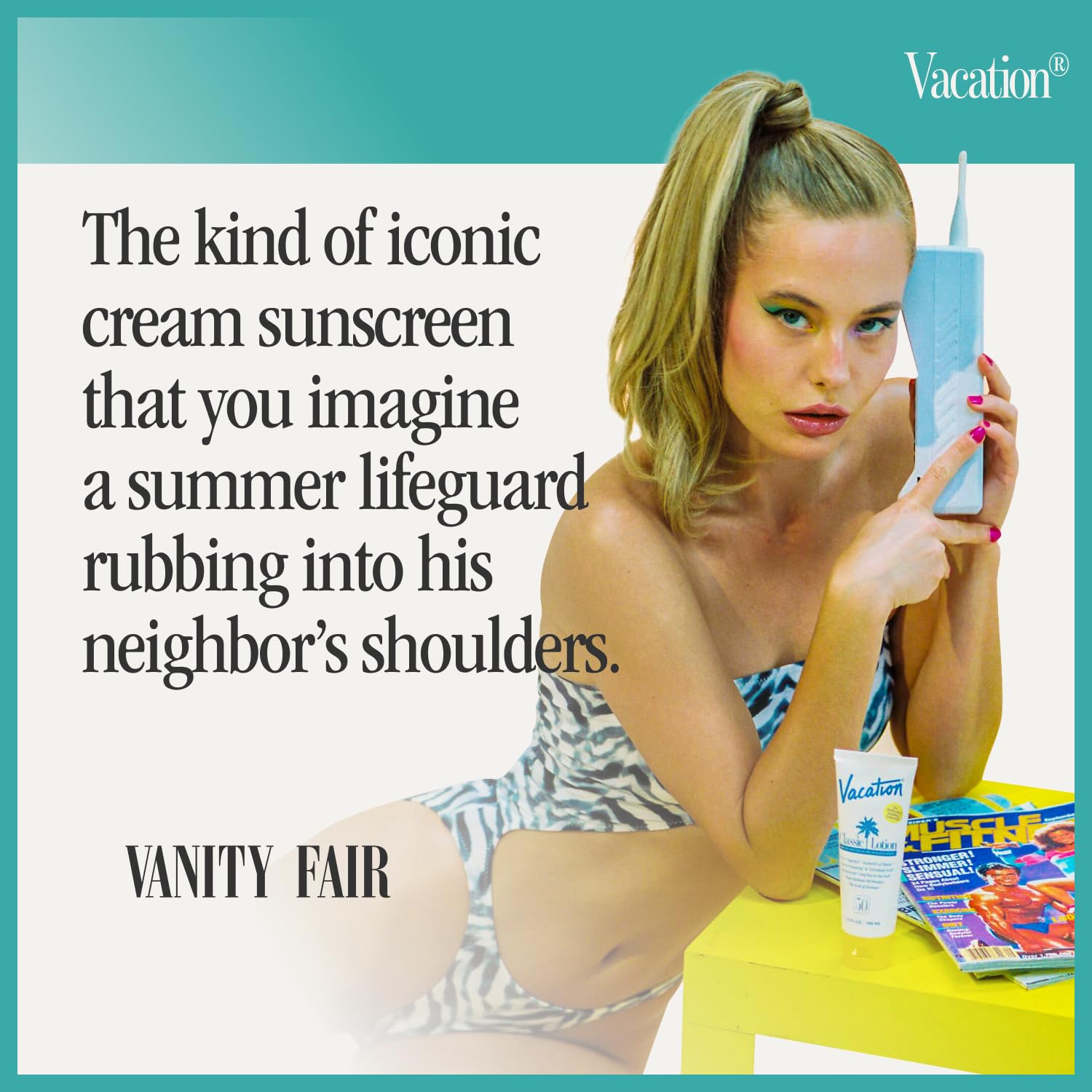 Vacation’s signature scent of coconut, banana, pool water, pool toy and swimsuit fabric. Vacation’s signature scent of coconut, banana, pool water, pool toy and swimsuit fabric. Features a subtle hint of Vacation’s signature scent of coconut, banana, pool water, pool toy and swimsuit fabric. Features the signature “Baby Oil Accord” fragrance developed in conjunction with ARQUISTE Parfumeur. Contains the Vacation brand “Grand Cru ’86” scent inspired by the celebratory magnetism and charisma of the coveted libation. The signature scent of the Vacation Sunscreen Company with notes of coconut, banana, pool water, pool toy and swimsuit fabric.