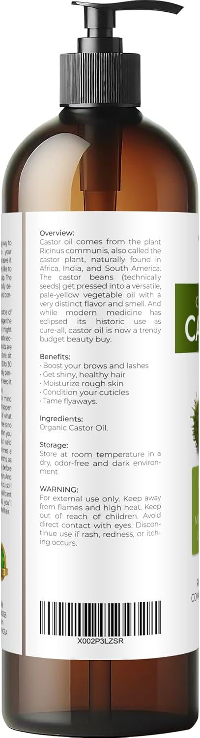 USDA Certified Organic Castor oil: 100% Pure & Natural oil from Castor Plant: Ricinus Communis. Not Diluted, Non-GMO, No Additives, No Fragrance, Chemicals Free, Alcohol Free.
