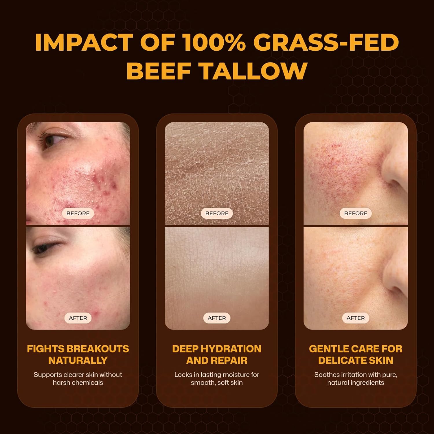 PREMIUM INGREDIENTS – We Sourced Only The Finest Ingredients: Grass Fed Grass Finished Beef Tallow, Raw Honey, Organic Cold-pressed Olive Oil, Vitamin E.