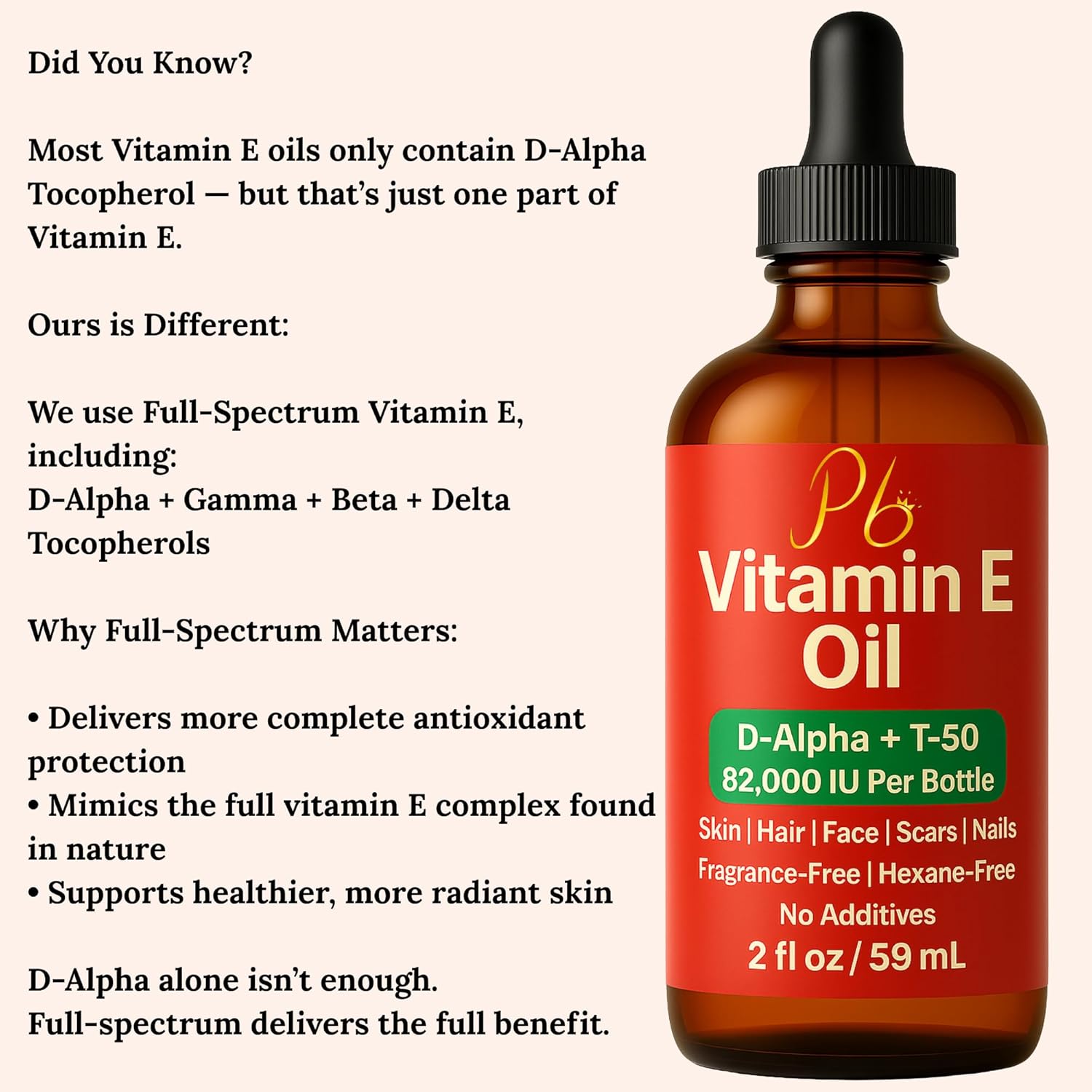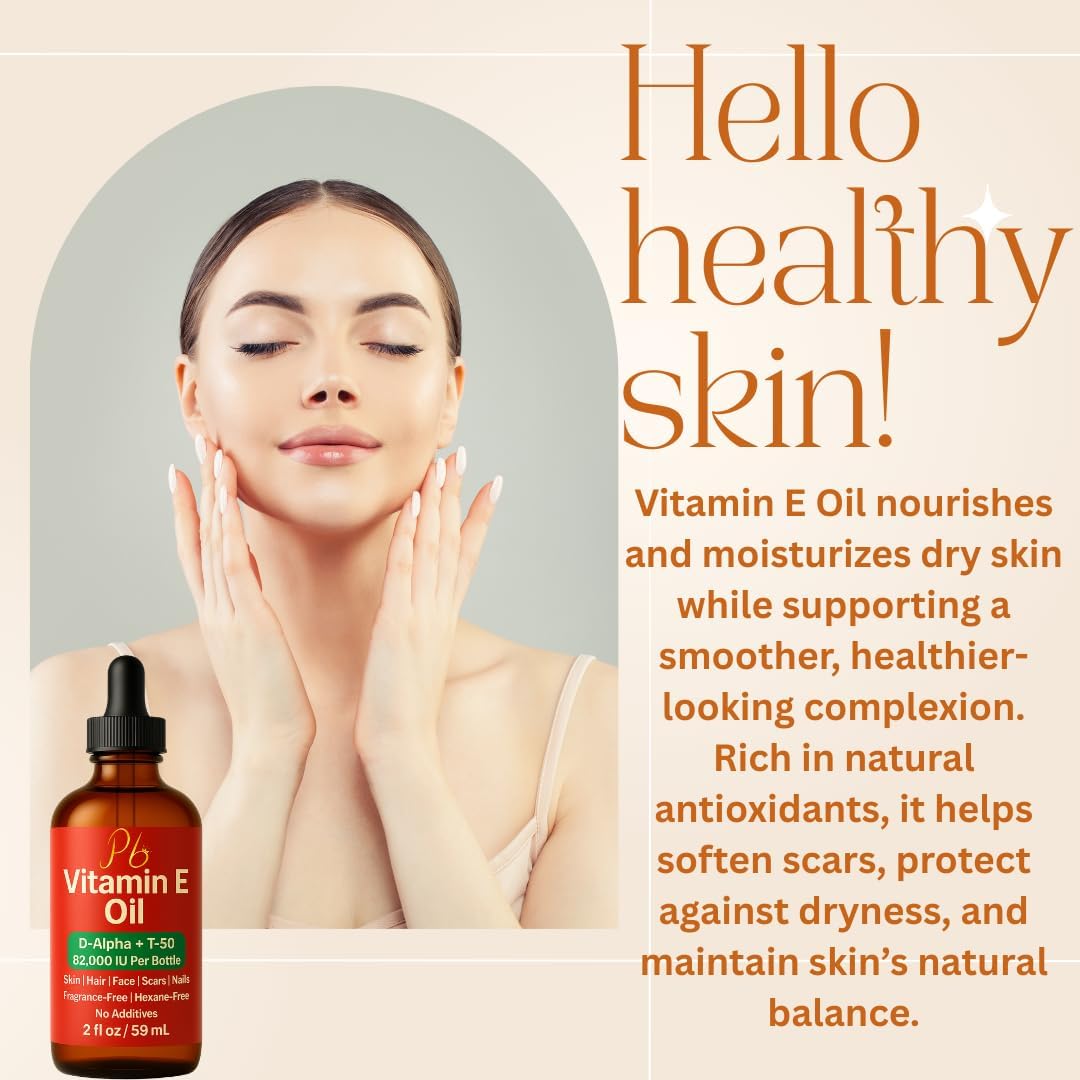 82,000 IU Vitamin E Per Bottle – Broad-Spectrum Tocopherols: Formulated with 82,000 IU of Vitamin E per bottle, this concentrated oil features a broad-spectrum blend of D-Alpha, Gamma, Beta, and Delta tocopherols. Made in the USA, it delivers powerful antioxidant nourishment to support visibly smoother, healthier-looking skin and hair.