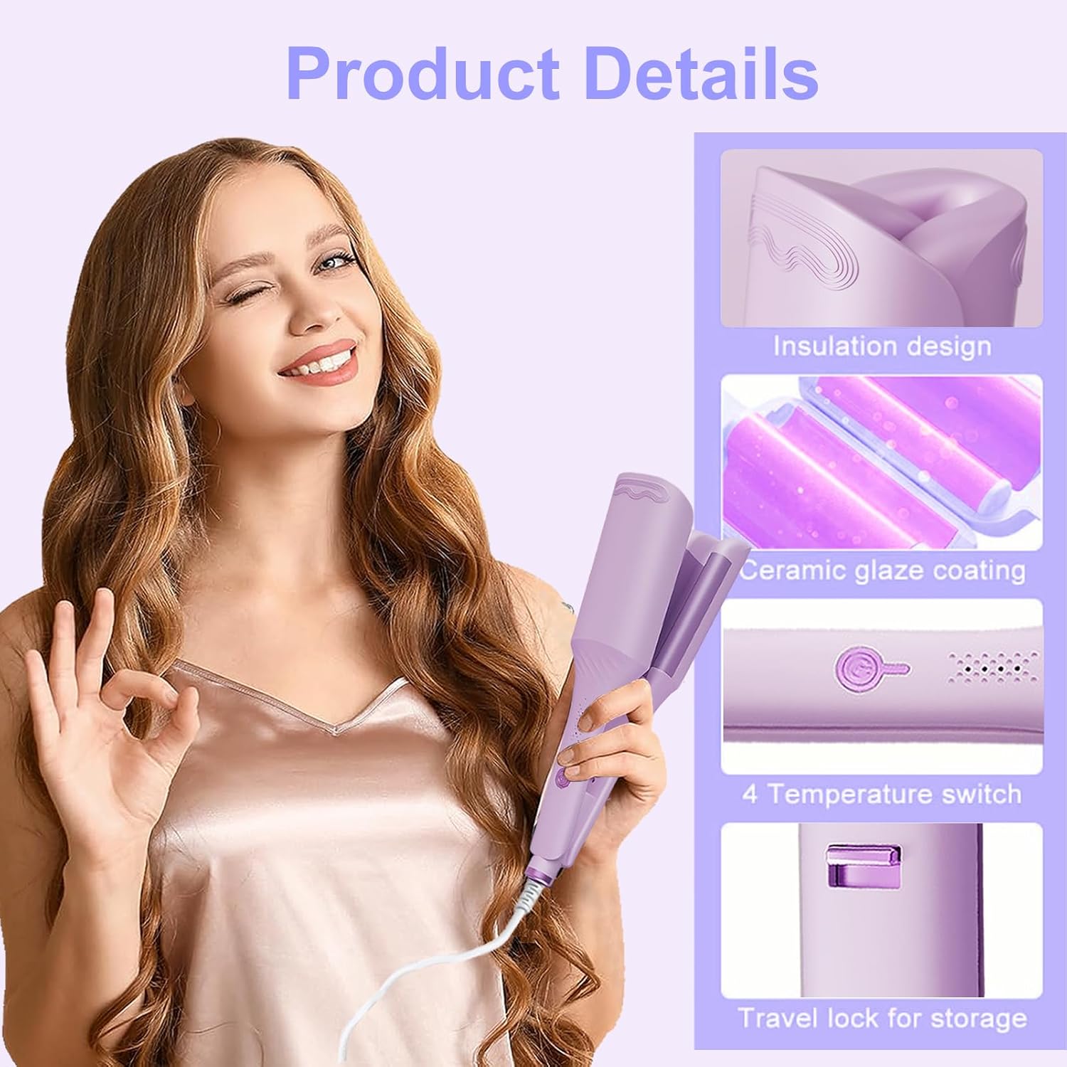 Waver Hair Crimper, 1.25 Inch Curling Wands with Ceramic 3 Barrels, 4 Temp Settings, Heat Resistant Glove, Fast Heating Crimper Hair Iron for Short and Long Hair (Purple)