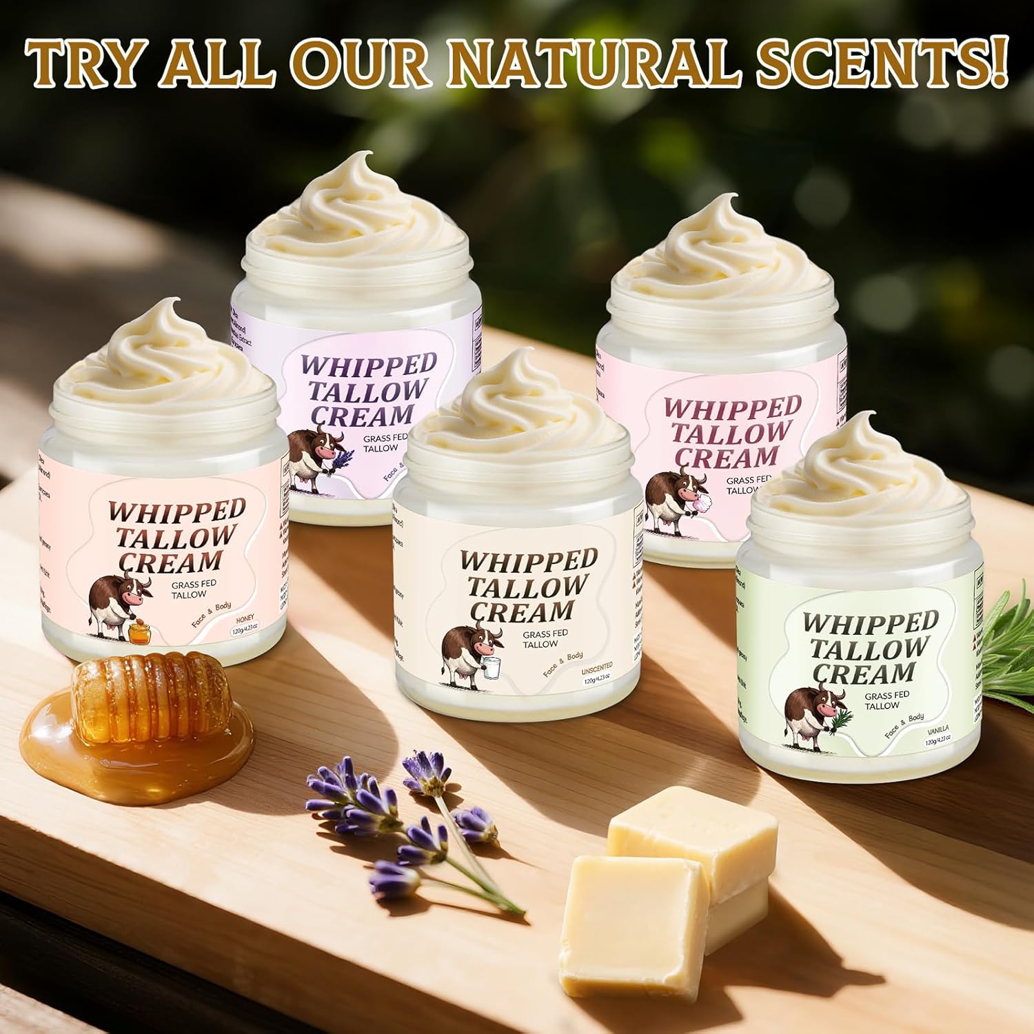 【100% Natural Ingredients & Zero burden】From the Farm to your Home. Full oil formula with agricultural handicraft production. This whipped tallow cream use 100% grass fed beef tallow, Shea Butter, Olea Europaea(Olive)Fruit Oil, Sweet Almond Oil and nothing. Contain a rich source of vitamin A and Vitamin E that are vital to skin health. Vitamin A helps maintain normal skin function and promotes skin cell regeneration, while Vitamin E is a powerful antioxidant that protects the skin from free radical damage and slows down skin aging.