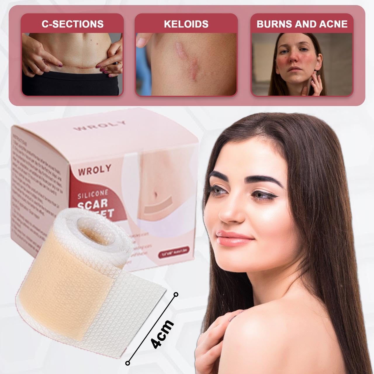 WROLY Silicone Scar Sheets,s a dermatologist-recommended, pain-free solution designed to visibly reduce the appearance of both old and new scars.